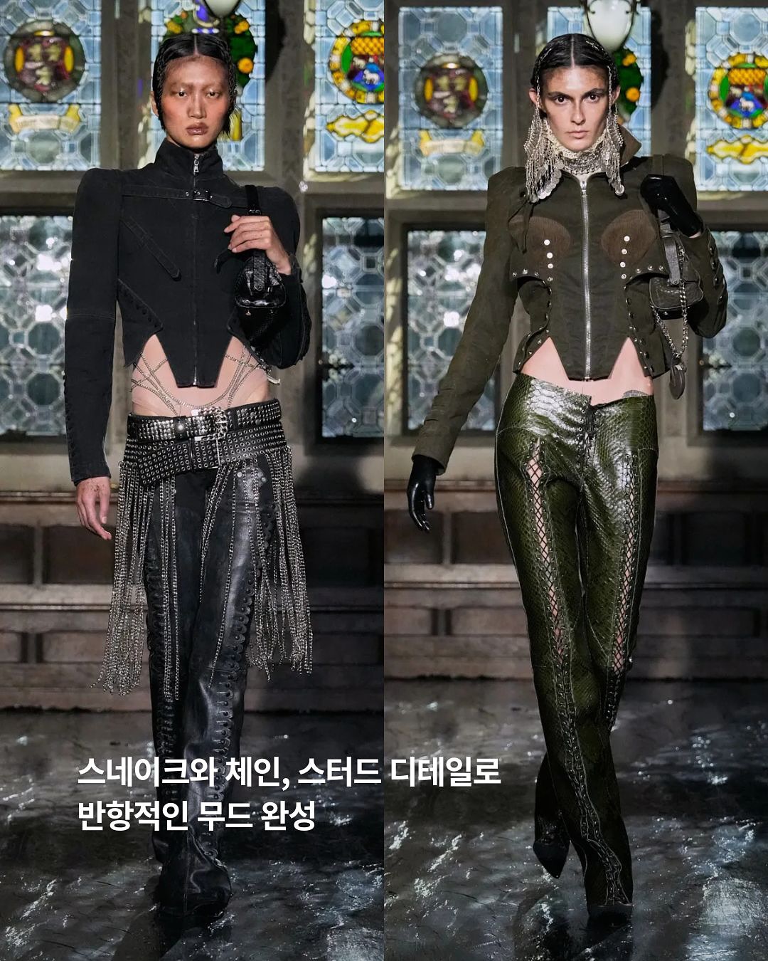 가죽과 텍스처 대비가 돋보이는 룩들로 반항적이면서도