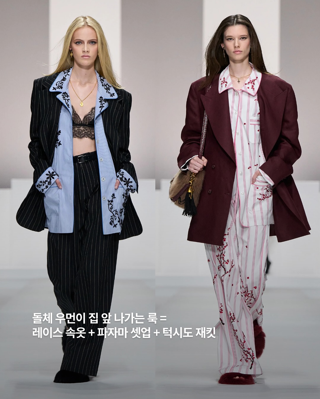 ▪️영화 <악프입>의 주인공 메릴 스트립과 스탠리 투치가 쇼에 등장해 현장을 압도함▪️보그 매거진은 안나 윈투어와 메릴 스트립이 만나는 영상 클립을 공개하기도 함2️⃣ 여성복 파자마▪️지난 여름 남성복 쇼에서의 파자마 컨셉에 이은 여성 파자마 라인업▪️꽃자수·크리스털 장식 + 레이스 속옷 매치로 침실 룩을 럭셔리화함▪️파자마 셋업에 턱시도 재킷을 더해 관능적인 이브닝 파자마 룩3️⃣ 퍼 활용▪️퍼 슬리퍼로 파자마 룩 완성▪️특히 퍼가 다양하게 포인트로 활용된 백들을 선보임4️⃣ 세대 교체 무드