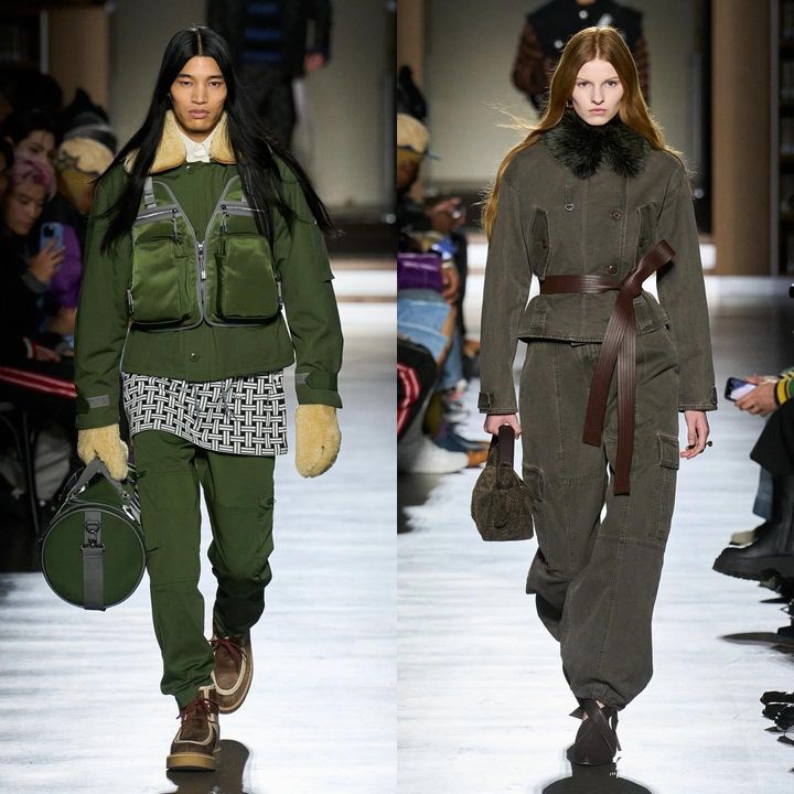 1️⃣ 로에베 (@loewe) ▪️”콜라주”를 테마로 아이템을 하나로 연결한 컬렉션 ▪️와이드 한 핏의 레더 카고 팬츠와 슬림핏의 군녹색 카고 팬츠 ▪️와이드 카고 팬츠에는 허리에 하프 벨트를 달아 허리선을 잡아줌 ▪️체크 셔츠, 그랜파코어 스웨터 등의 상의와 매치한 캐주얼 룩 ▪️현 CD: 조나단 앤더슨 (@jonathan.anderson)