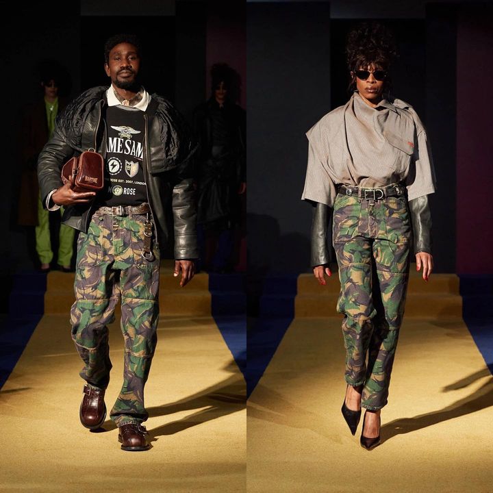 5️⃣ 마틴 로즈 (@martine_rose) ▪️댄스 플로어를 연상시키는 활기찬 컬렉션을 선보임 ▪️남성복 & 여성복 두 가지 버전으로 선보인 카모플라주 카고 팬츠 ▪️여성복의 경우 하이힐과 매치해 파티스러운 룩을 선보임 ▪️현 CD: 마틴 로즈 (@martine_rose)