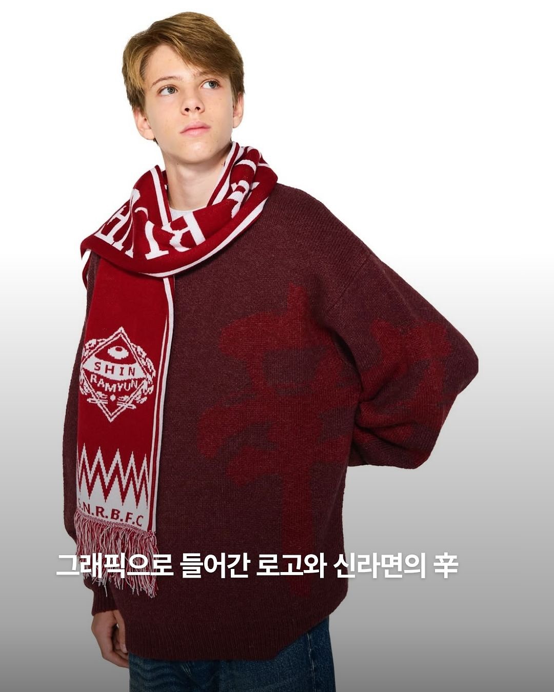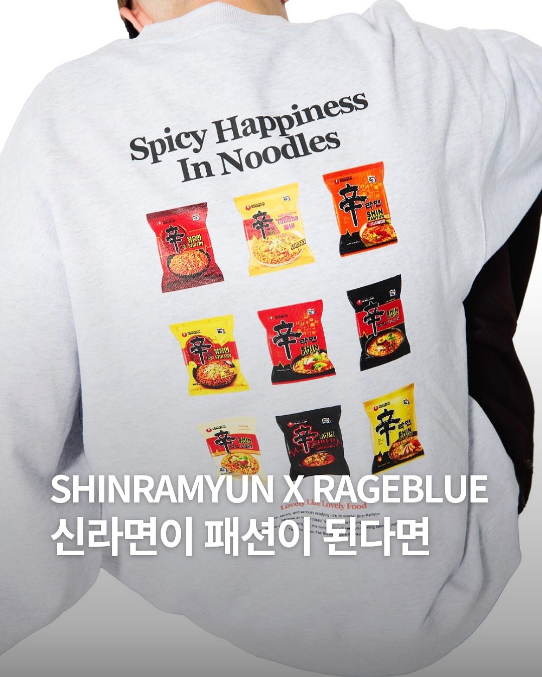 ▪️신라면의 글로벌 슬로건인 ‘Spicy Happiness In Noodles(면발 속 매운 행복)‘가 스웻셔츠 및 머플러 디자인에 등장