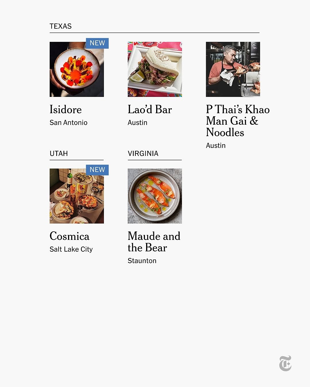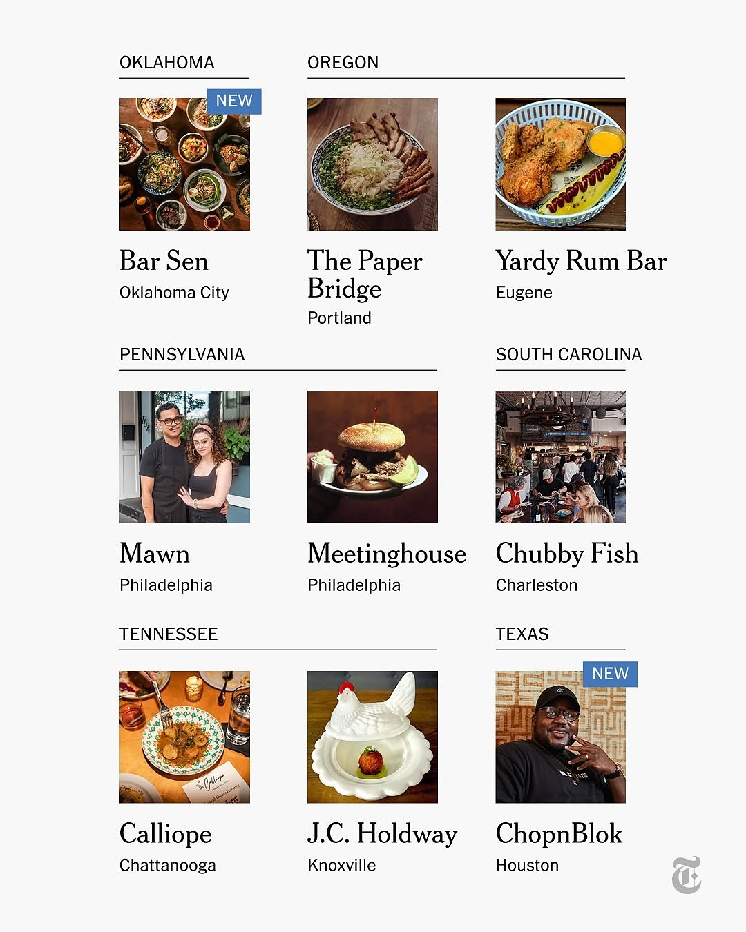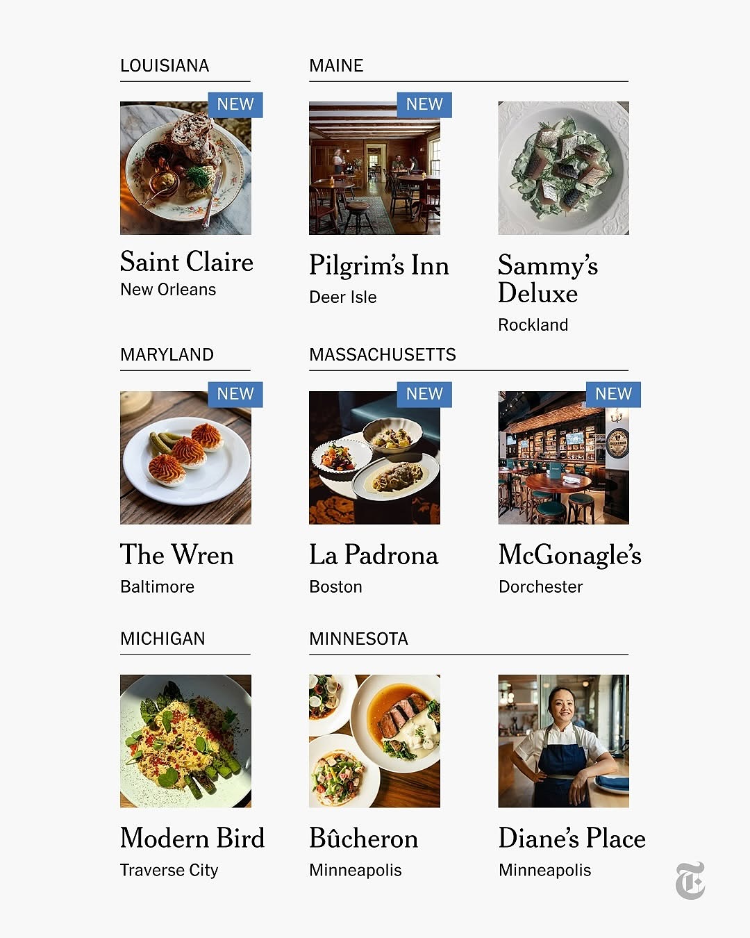 ▪️캘리포니아: Mori Nozomi (LA), Verjus (SF), Baby Bistro (LA) ▪️뉴욕: Kabawa (Manhattan), Ha’s Snack Bar (Manhattan), Borgo (Manhattan) ▪️일리노이: Sanders BBQ Supply Co. (Chicago) ▪️텍사스: ChòpnBlok (Houston), Lao’d Bar (Austin) ▪️루지아나: Emeril’s (New Orleans), Saint Claire (New Orleans) ▪️플로리다 : Sunny’s Steakhouse (Miami) ▪️메인: Pilgrim’s Inn (Deer Isle)