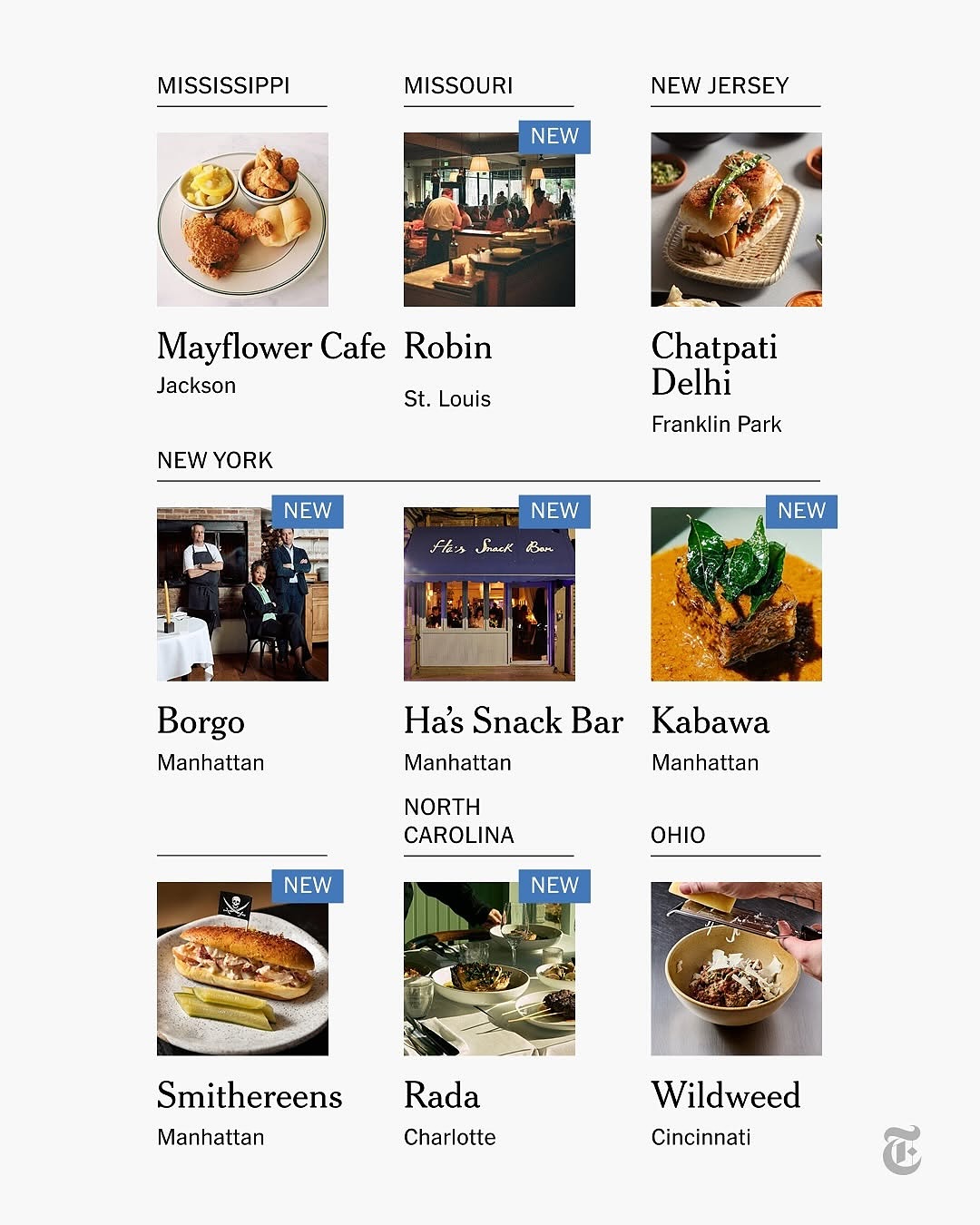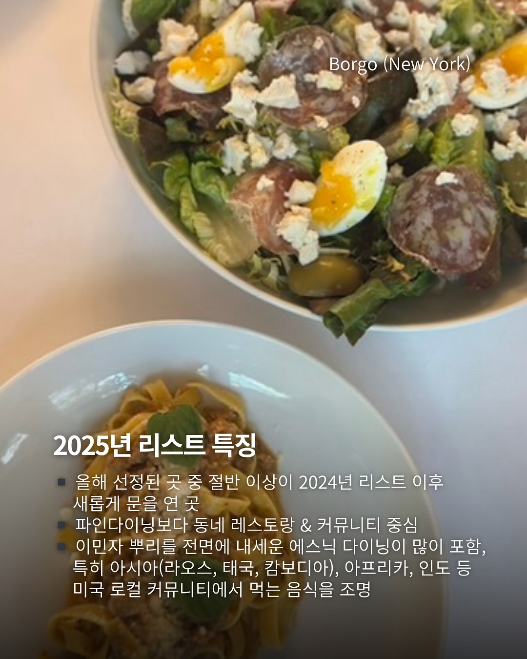 ▪️올해 선정된 곳 중 절반 이상이 2024년 리스트 이후 새롭게 문을 연 곳으로 진행 ▪️파인다이닝보다는 동네 레스토랑과 커뮤니티 중심의 공간들이 주목 ▪️예전처럼 프렌치·이탈리안 중심이 아니라, 이민자 뿌리를 전면에 내세운 에스닉 다이닝이 많이 포함 ▪️특히 아시아(라오스, 태국, 캄보디아), 아프리카, 인도 등 미국 로컬 커뮤니티의 음식을 조명 ▪️파인다이닝보다 커뮤니티 기반의 정체성 있는 메뉴가 돋보임