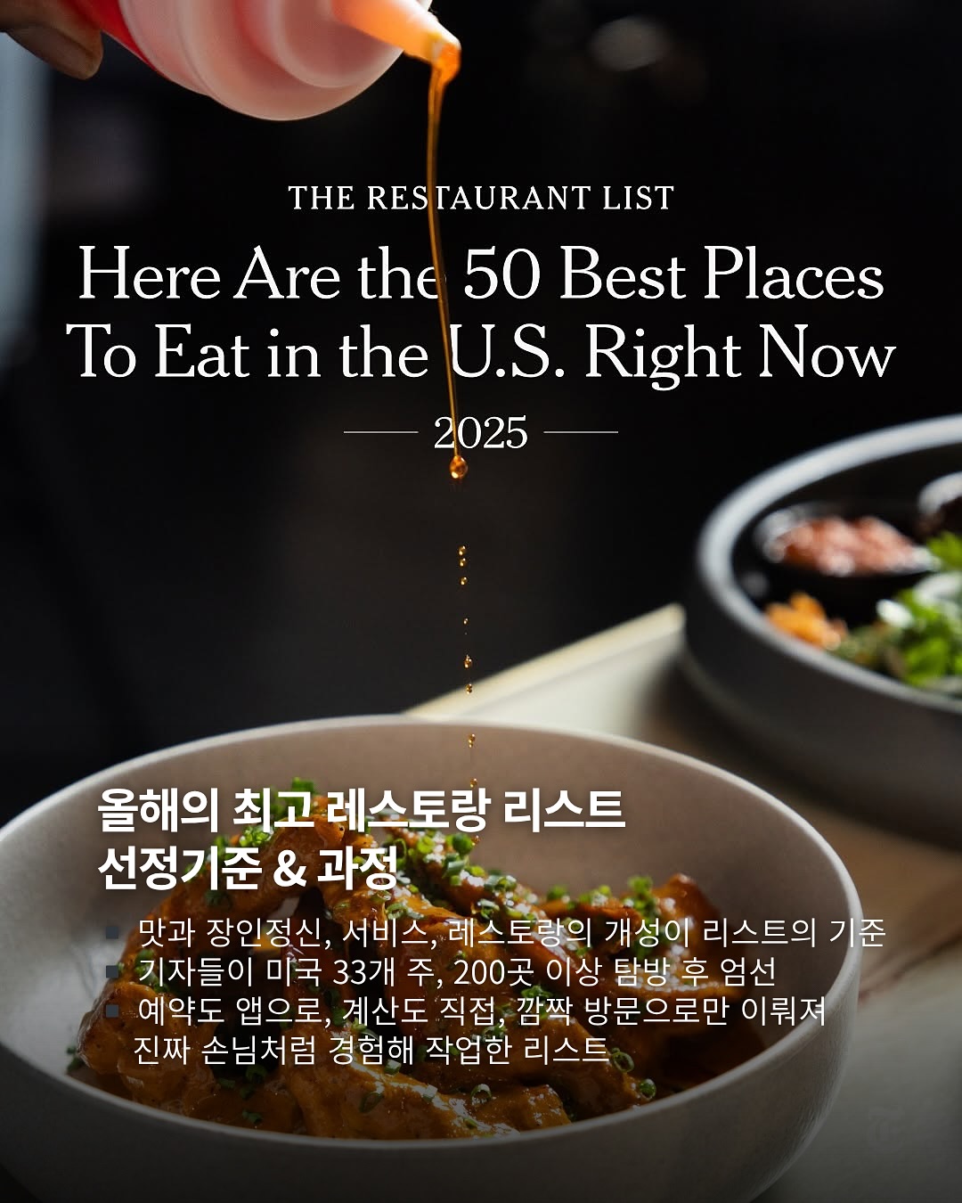 ▪️맛과 장인정신, 서비스, 레스토랑의 개성이 리스트의 기준 ▪️시골에 위치한 135년 된 다이닝룸부터 마이애미의 스테이크하우스, 캔자스의 BBQ 전문점까지 장르와 가격을 불문하고 선정 ▪️기자와 에디터들이 미국 33개 주, 200곳 이상을 탐방한 뒤 엄선 ▪️예약도 앱으로, 계산도 직접하며 깜짝 방문으로만 이뤄져 진짜 손님처럼 경험한 평가 반영