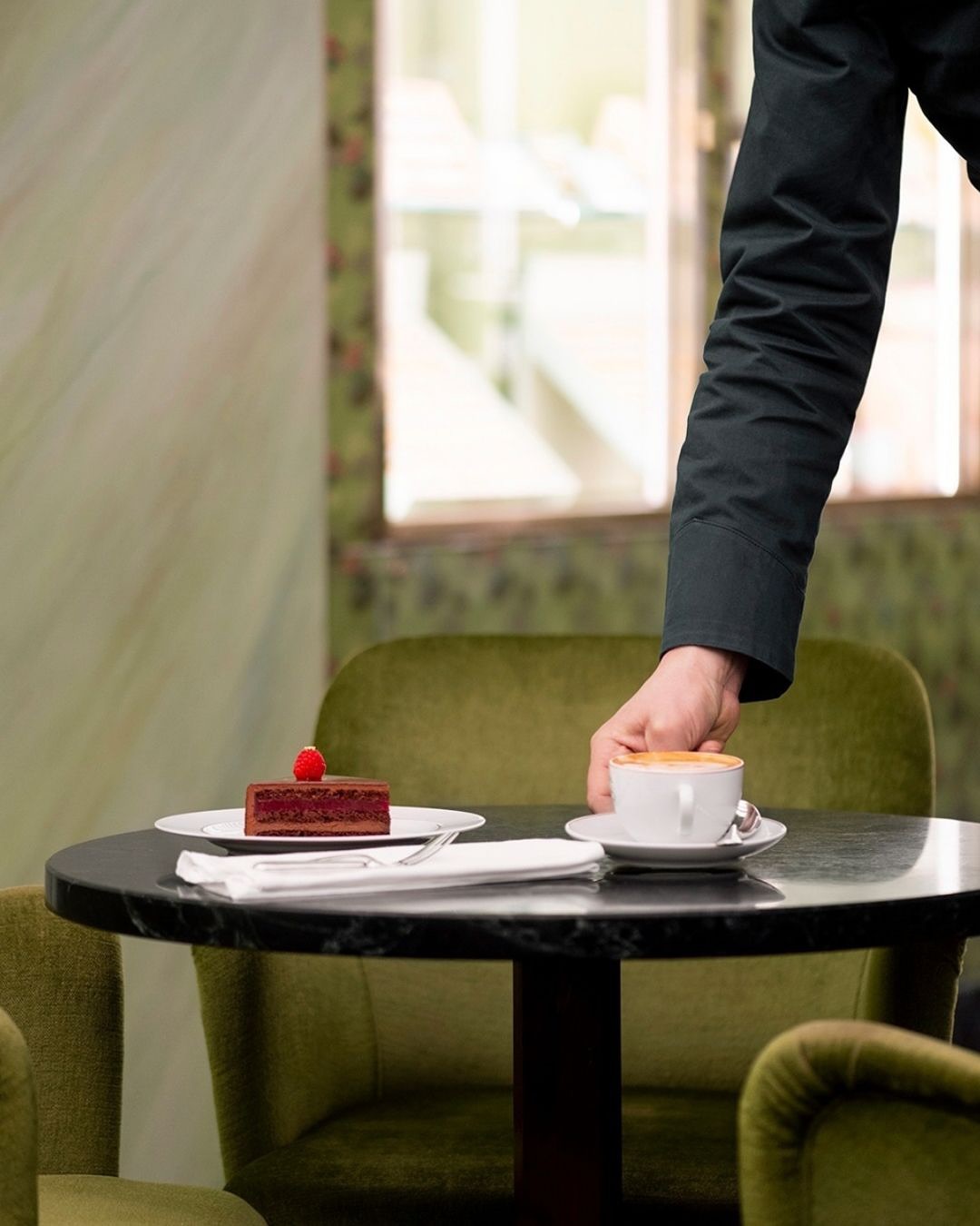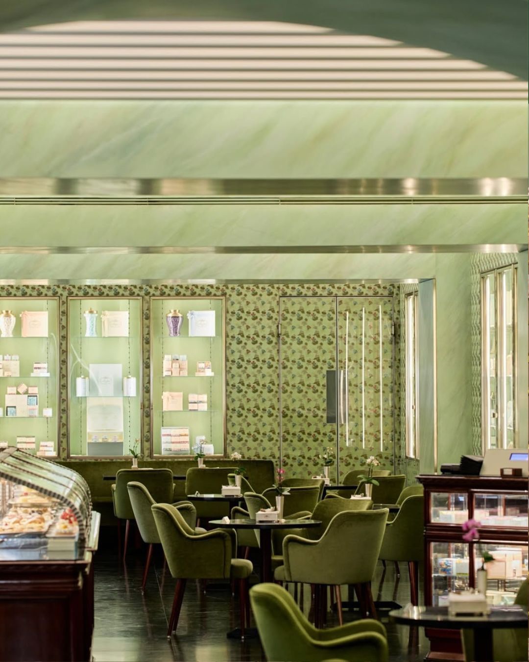▪️초록빛 대리석과 황동 프레임, 유리 쇼케이스가 만들어내는 고전적 리듬이 특징