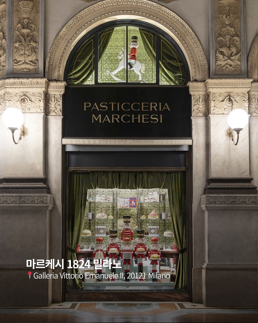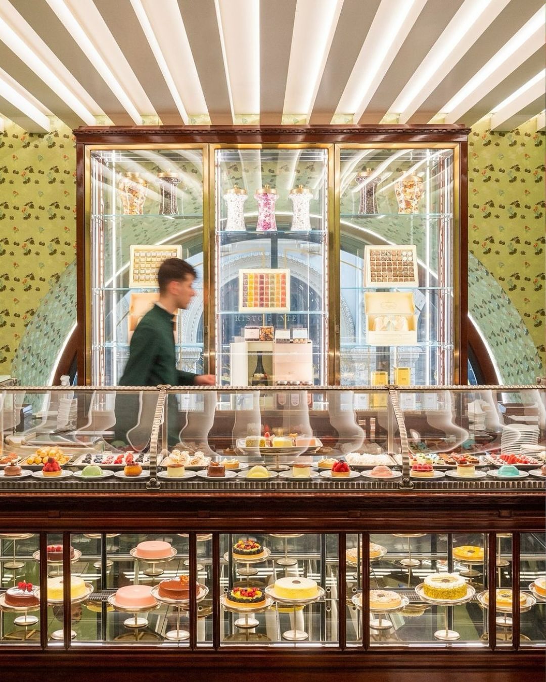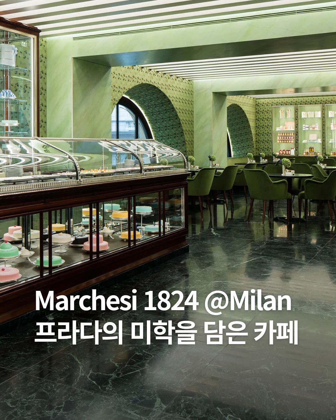 1️⃣ 시간의 층위를 품은 공간 ▪️1824년 이탈리아 밀라노에서 시작된 파스티체리아 마르케시의 전통을 계승한 공간 ▪️2014년 프라다 그룹이 인수 후 ‘헤리티지와 모던함의 공존’을 주제로 재해석 ▪️초록빛 대리석과 황동 프레임, 유리 쇼케이스가 만들어내는 고전적 리듬이 특징