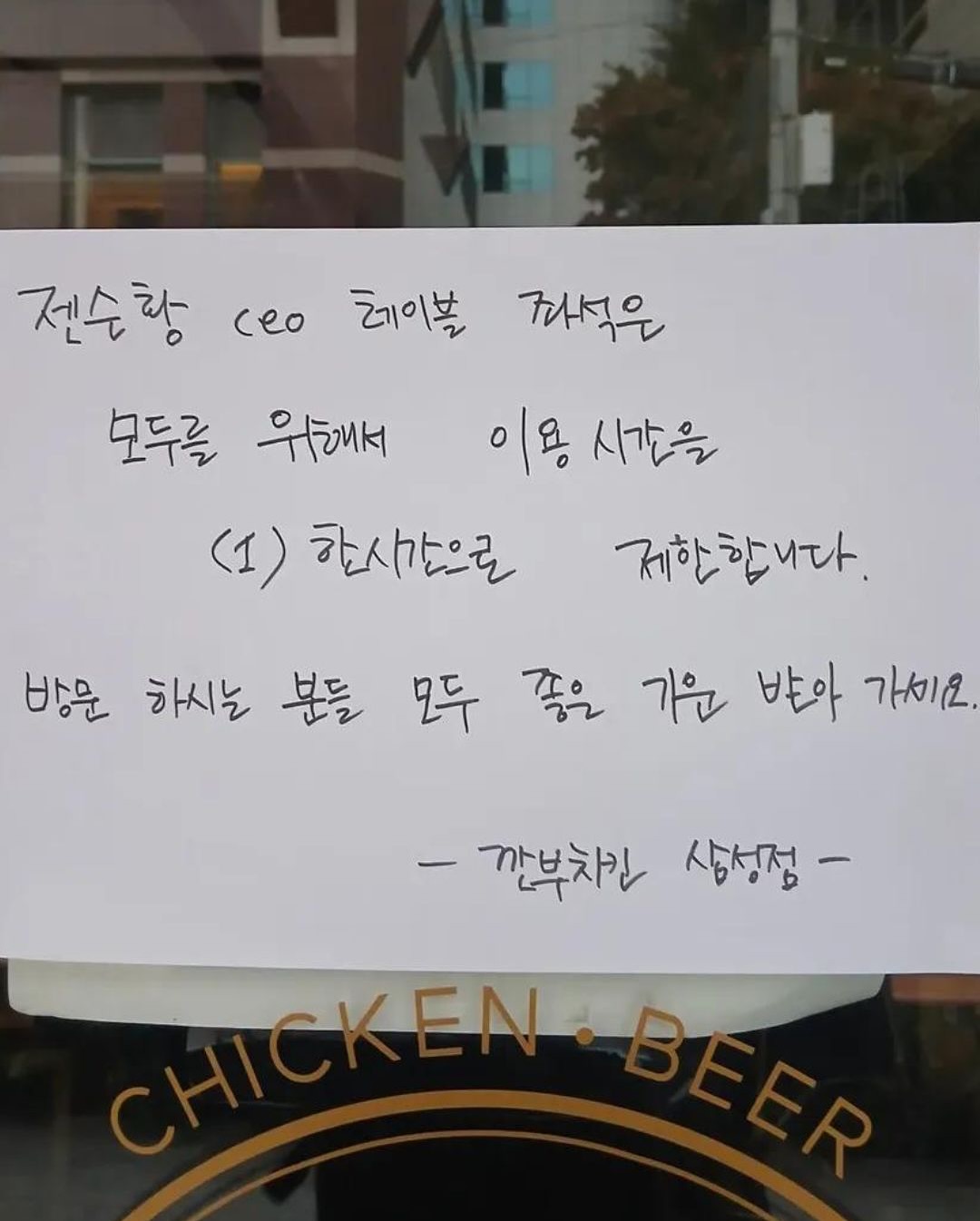큰 화제가 되었던 ‘깐부치킨 삼성점’에 새로운 안내문이 부착되었습니다