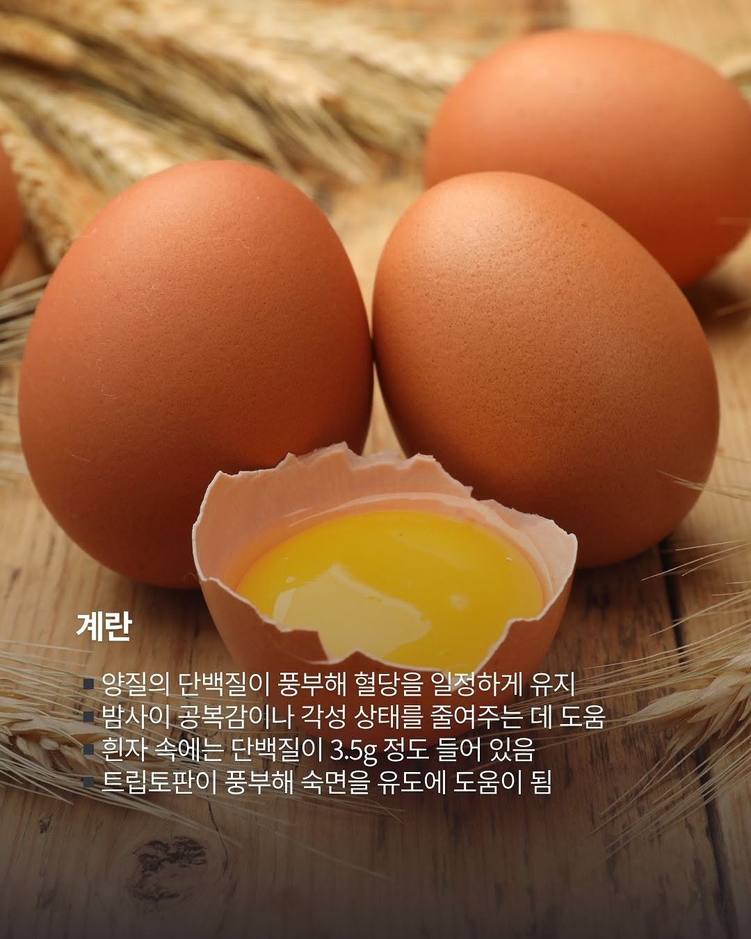 ▪️양질의 단백질이 풍부해 혈당을 일정하게 유지시켜 밤사이 공복감이나 각성 상태를 줄여주는 데 도움 ▪️흰자 속에는 단백질이 3.5g 정도 들어 있음 ▪️아미노산의 일종인 트립토판이 풍부해 마음을 안정시키고 숙면을 유도하는 데 도움이 됨