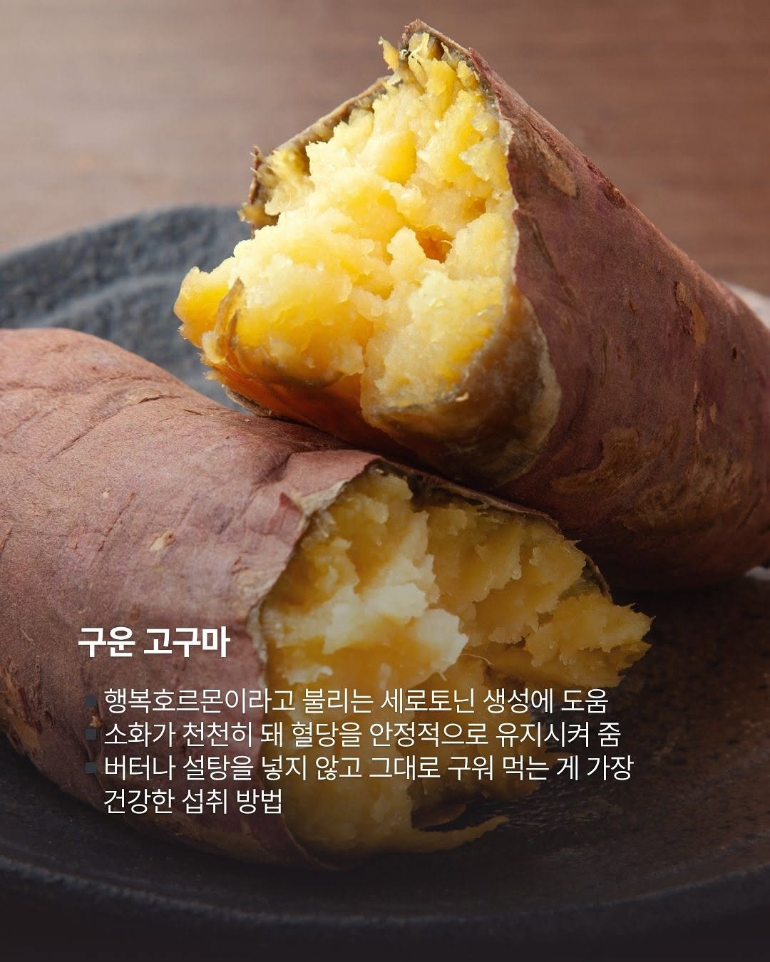 ▪️복합탄수화물과 비타민 B6가 풍부해 세로토닌 생성을 도움 ▪️소화가 천천히 돼 혈당을 안정적으로 유지시켜 줌 ▪️버터나 설탕을 넣지 않고 그대로 구워 먹는 게 가장 건강한 섭취 방법