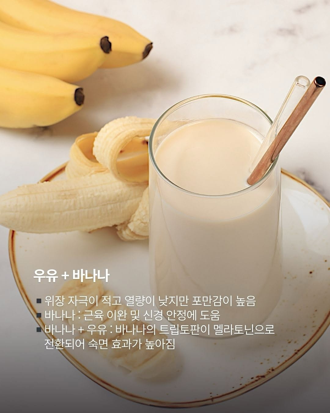 ▪️위장에 가해지는 자극이 적고 열량도 낮아 적은 양으로도 쉽게 포만감을 느낄 수 있음 ▪️바나나에는 트립토판, 마그네슘, 칼륨이 풍부해 근육을 이완시키고 신경을 안정시키는 데 도움이 됨 ▪️따뜻한 우유를 함께 마시면 트립토판이 멜라토닌으로 전환되어 숙면 효과가 높아짐 ▪️잠자기 약 한 시간 전 바나나 반 개와 따뜻한 우유 한 컵 정도 섭취 권장