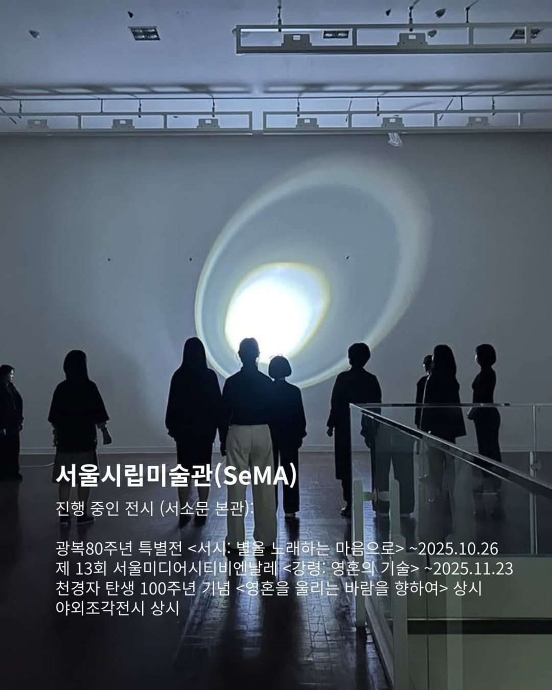3️⃣ 서울시립미술관(SeMA @seoulmuseumofart) ▪️위치: 서울 중구 덕수궁길 61, 서울시립미술관 ▪️진행 중인 전시: <광복80주년 특별전 서시: 별을 노래하는 마음으로>, <제 13회 서울미디어시티비엔날레 강령: 영혼의 기술>, <천경자 탄생 100주년 기념 영혼을 울리는 바람을 향하여 상시>, <야외조각전시 상시>