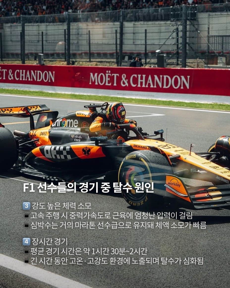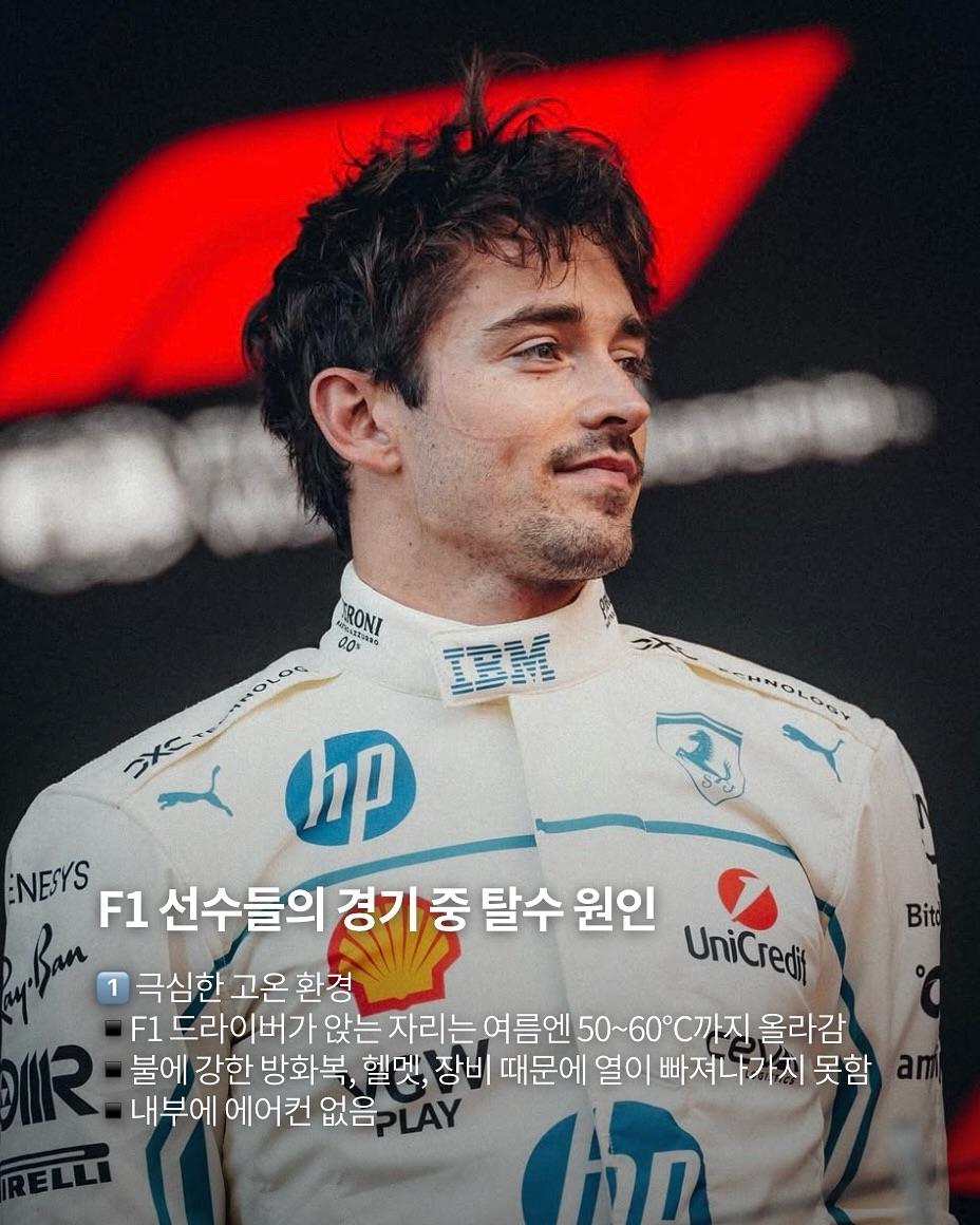 1️⃣극심한 고온 환경 ▪️F1 드라이버가 앉는 자리는 여름엔 50~60°C까지 올라감 ▪️불에 강한 방화복, 헬멧, 장비 때문에 열이 빠져나가지 못함 ▪️내부에 에어컨 없음