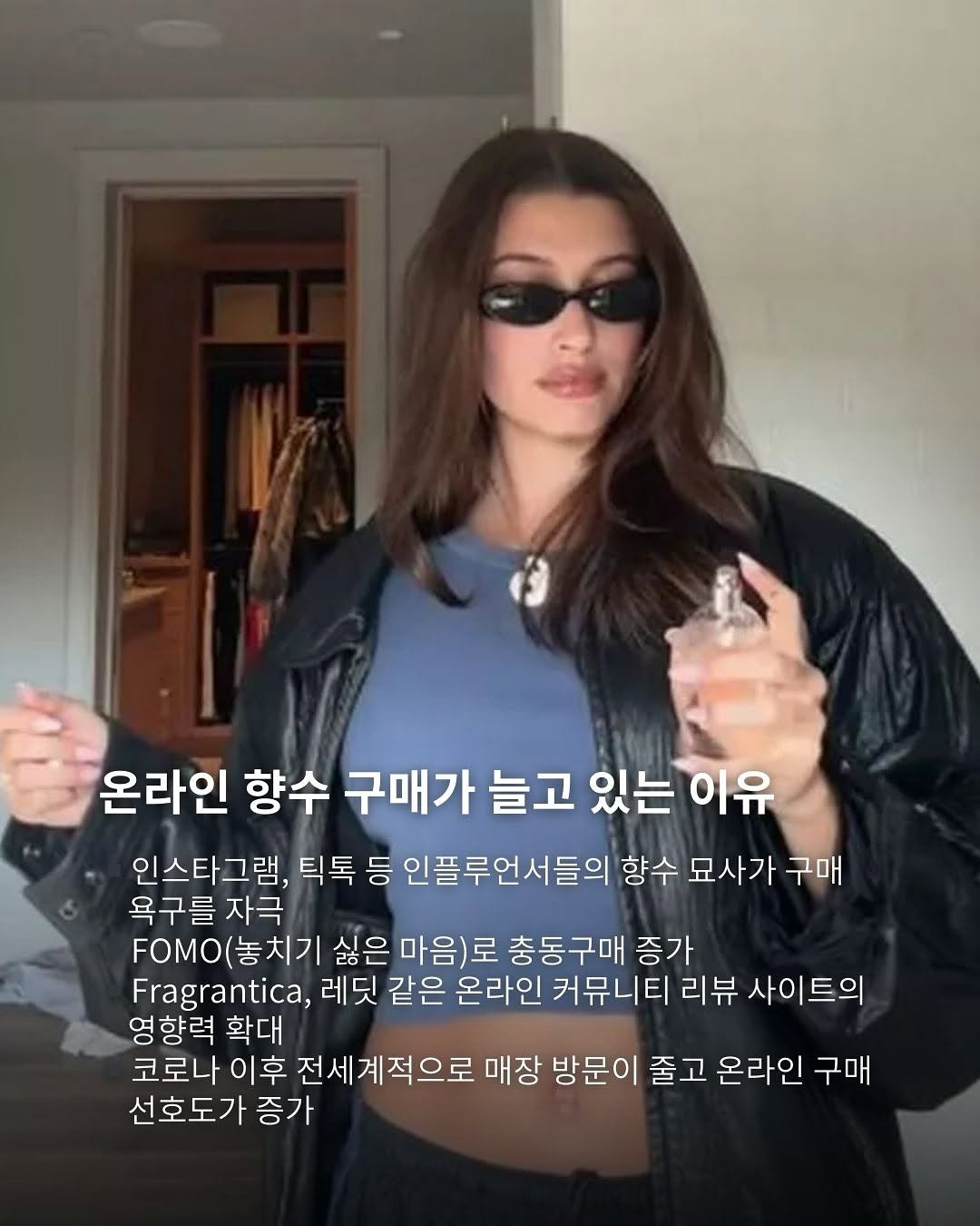 ▪️ 인스타그램, 틱톡 등 인플루언서들의 향수 묘사가 구매 욕구를 자극 ▪️ FOMO(놓치기 싫은 마음)로 충동구매 증가 ▪️ Fragrantica, 레딧 같은 온라인 커뮤니티 리뷰 사이트의 영향력 확대 ▪️ 코로나 이후 전세계적으로 매장 방문이 줄고 온라인 구매 선호도가 증가