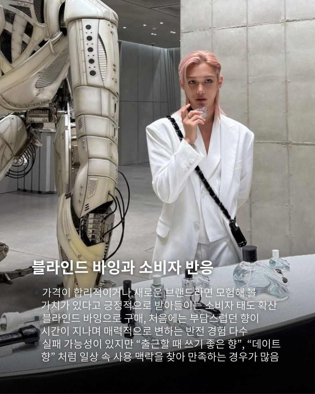 향수는 직접 맡아보고 구매하는 것이 정석이었지만 향수를 실제로 시향하지 않고 구매하는 ‘블라인드 바잉(Blind Buying)’ 문화가 급부상하고 있습니다