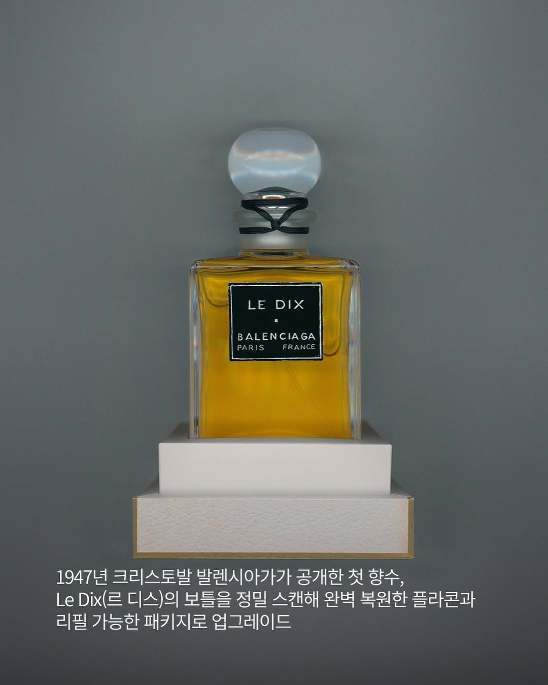 1947년 크리스토발 발렌시아가가 공개한 첫 향수, Le Dix(르 디스)의 보틀을 정밀 스캔해 완벽 복원한 플라콘까지 리필 가능한 패키지로 업그레이드