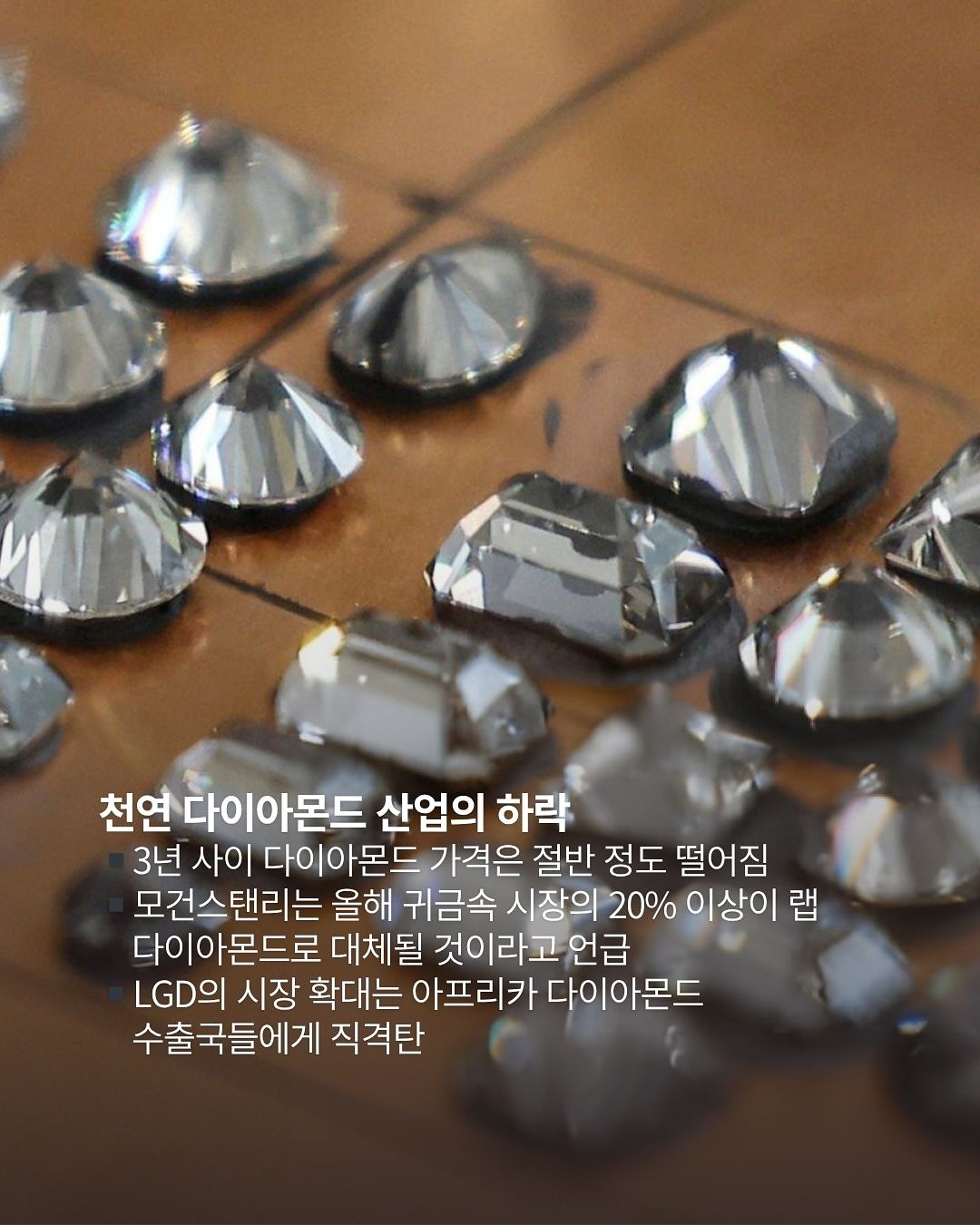 ▪️3년 사이 다이아몬드 가격은 절반 정도 떨어짐 ▪️모건스탠리는 올해 귀금속 시장의 20% 이상이 랩 다이아몬드로 대체될 것이라고 말함 ▪️LGD의 시장 확대는 아프리카 다이아몬드 수출국들에게 직격탄