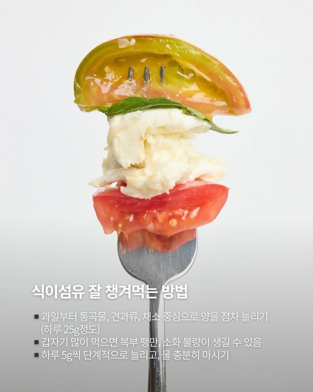 ▪️과일부터 통곡물, 견과류, 채소 중심으로 양을 점차 늘리기(하루 25g정도) ▪️갑자기 많이 먹으면 복부 팽만, 소화 불량이 생길 수 있음 ▪️하루 5g씩 단계적으로 늘리고, 물 충분히 마시기