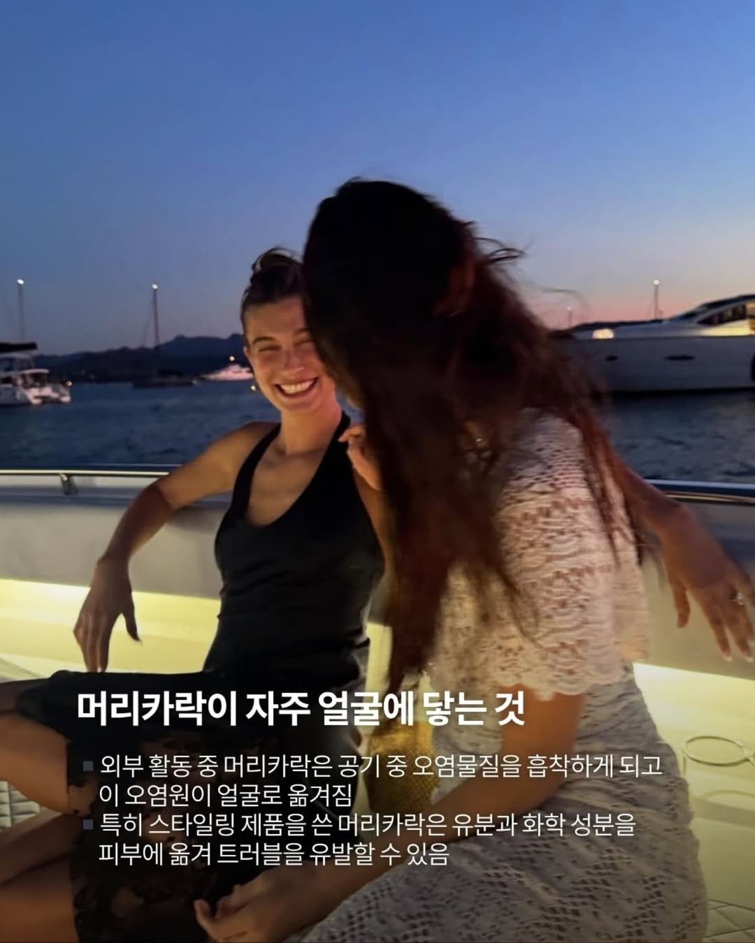 ▪️특히 스타일링 제품을 쓴 머리카락은 유분과 화학 성분을 피부에 옮겨 트러블을 유발할 수 있음
