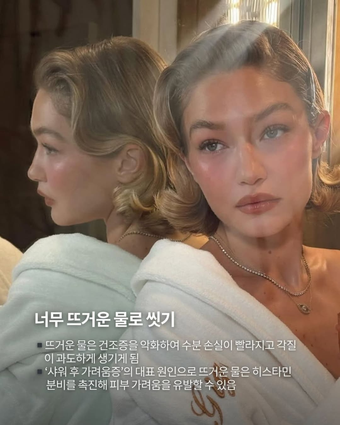 ▪️‘샤워 후 가려움증’의 대표 원인으로 뜨거운 물은 히스타민 분비를 촉진해 피부 가려움을 유발할 수 있음