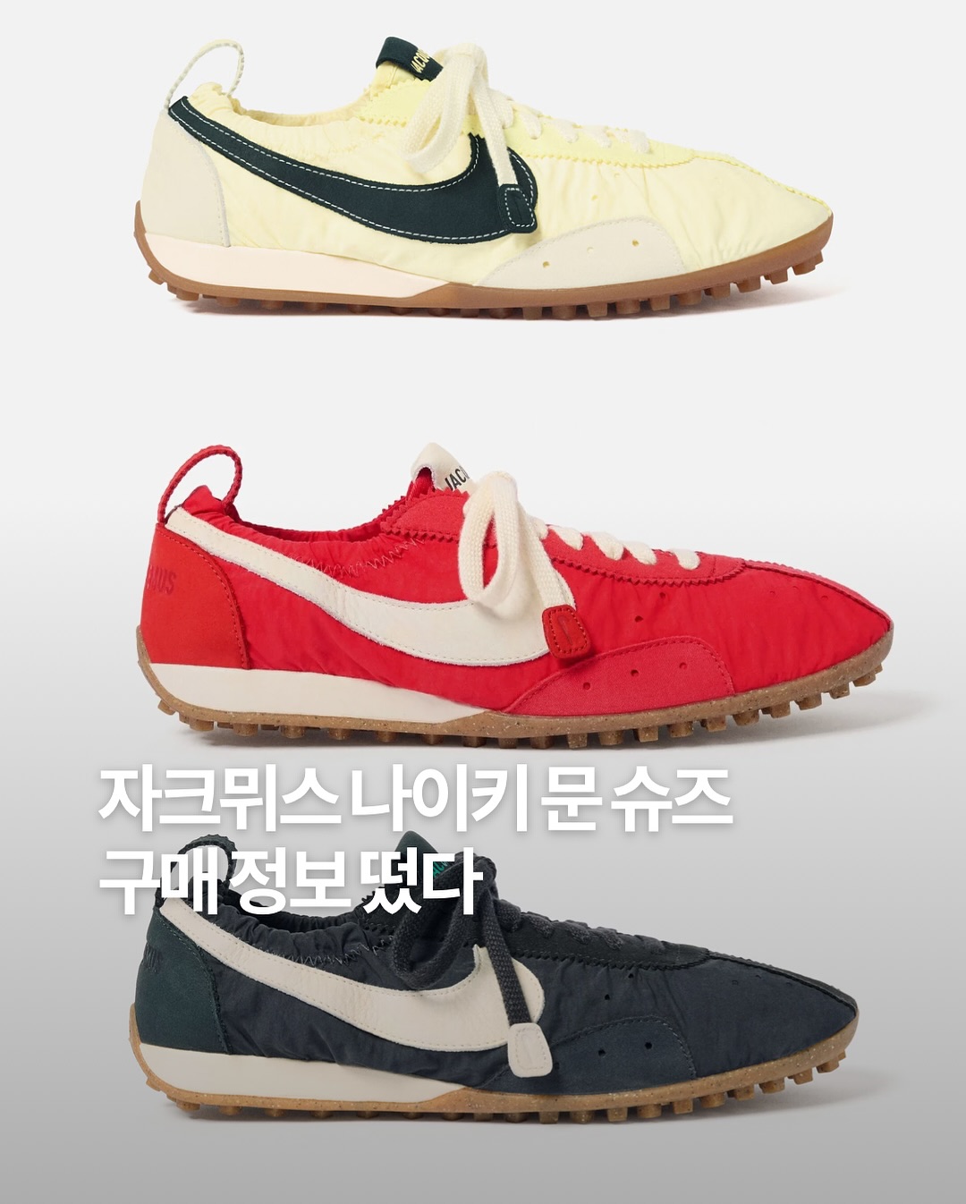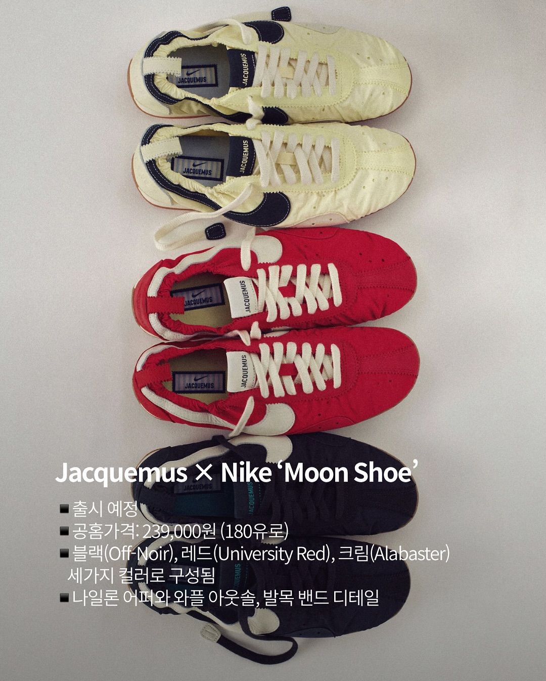 자크뮈스 나이키 문슈즈 공홈에서 곧 출시! 가격은 239,000원1972년 나이키 공동 창립자 빌 바우어맨이올림픽 육상 선발전을 위해 처음 제작했던 문 슈즈달 표면을 닮은 와플 아웃솔로 시작된 이 실험적 러닝화가이번 시즌 자크뮈스의 손길로 다시 태어났습니다✨클래식한 와플 패턴은 유지하면서미니멀한 어퍼와 세련된 컬러웨이로 완성된 디자인과거와 현재를 잇는 스니커 헤리티지로 재탄생한자크뮈스와 나이키의 문슈즈에 대해 알아보았습니다 ✍🏻📌 Jacquemus × Nike ‘Moon Shoe’인스타그램 @jacquemus @nike▪️출시 예정▪️공홈가격: 239,000원 (180유로)▪️블랙(Off-Noir), 레드(University Red), 크림(Alabaster) 세가지 컬러로 구성됨▪️나일론 어퍼와 와플 아웃솔, 발목 밴드 디테일#Jacquemus #Nike #MoonShoe📷 이미지 출처 자크뮈스 공식 사이트