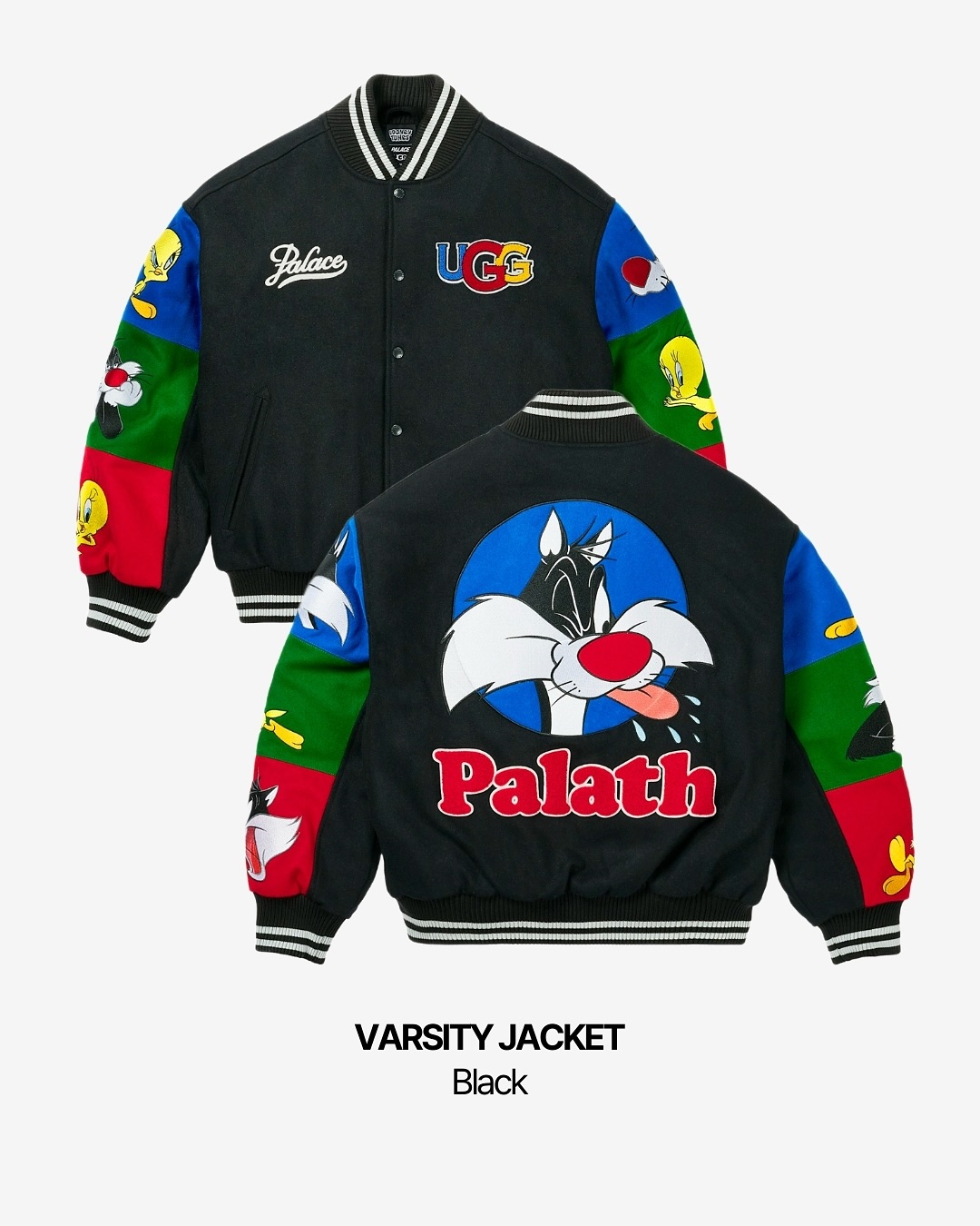 ▪️팔라스와 어그 그리고 루니 툰의 트리플 콜라보로 실베스터와 트위티의 추격 장면을 자수로 새긴 아이템이 특징