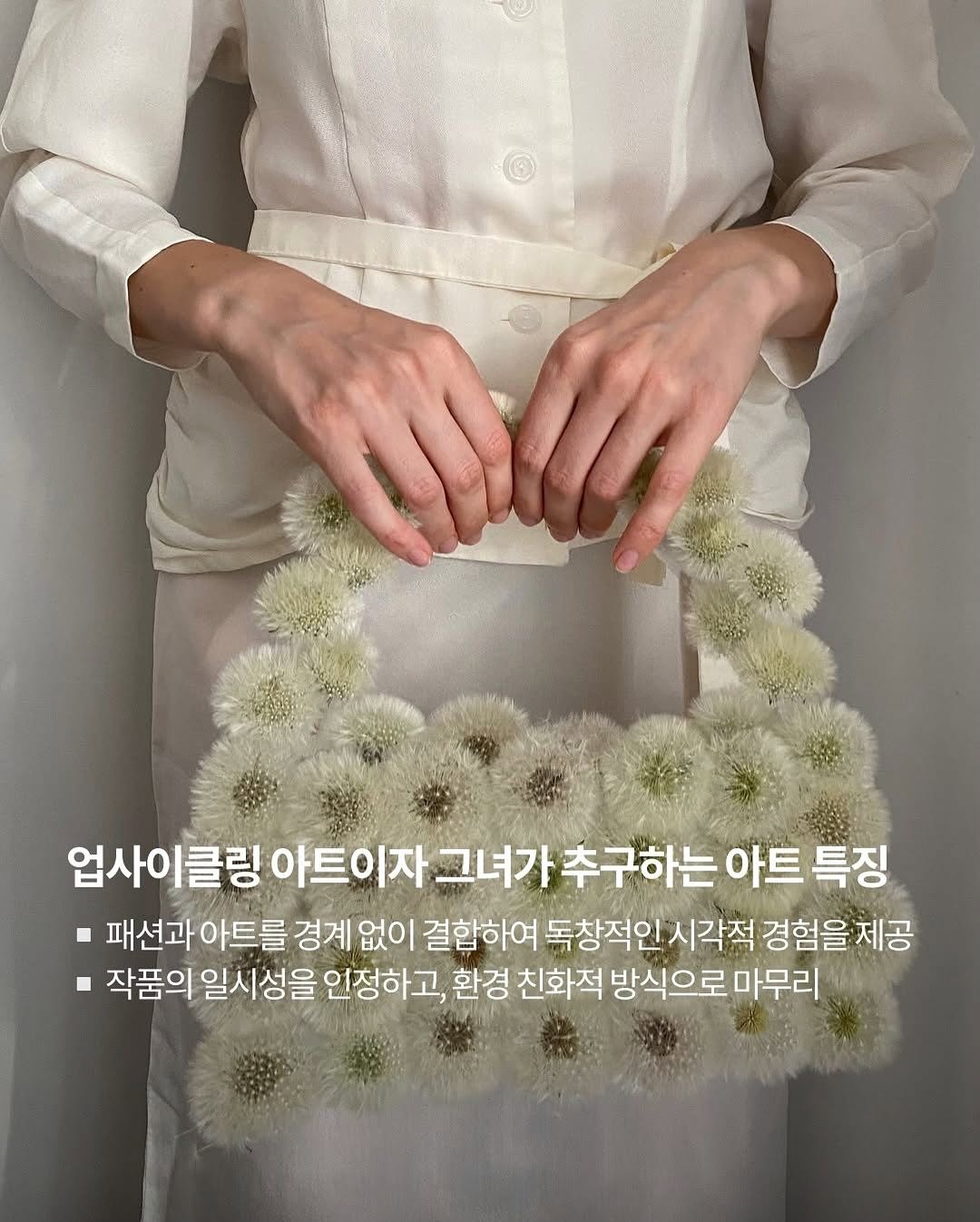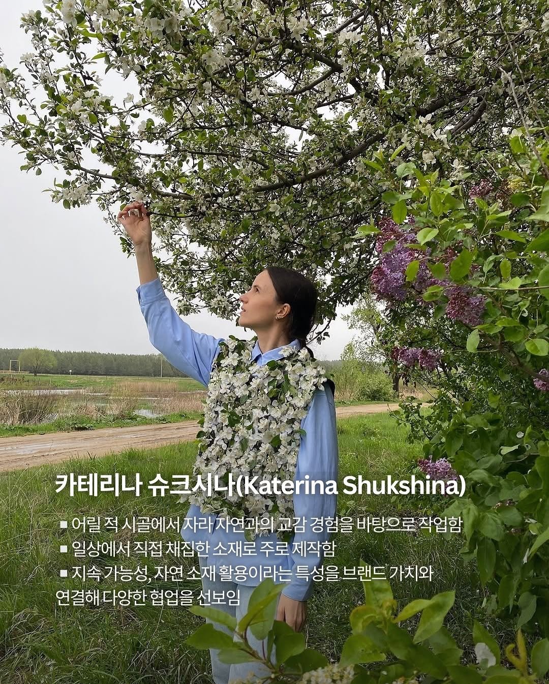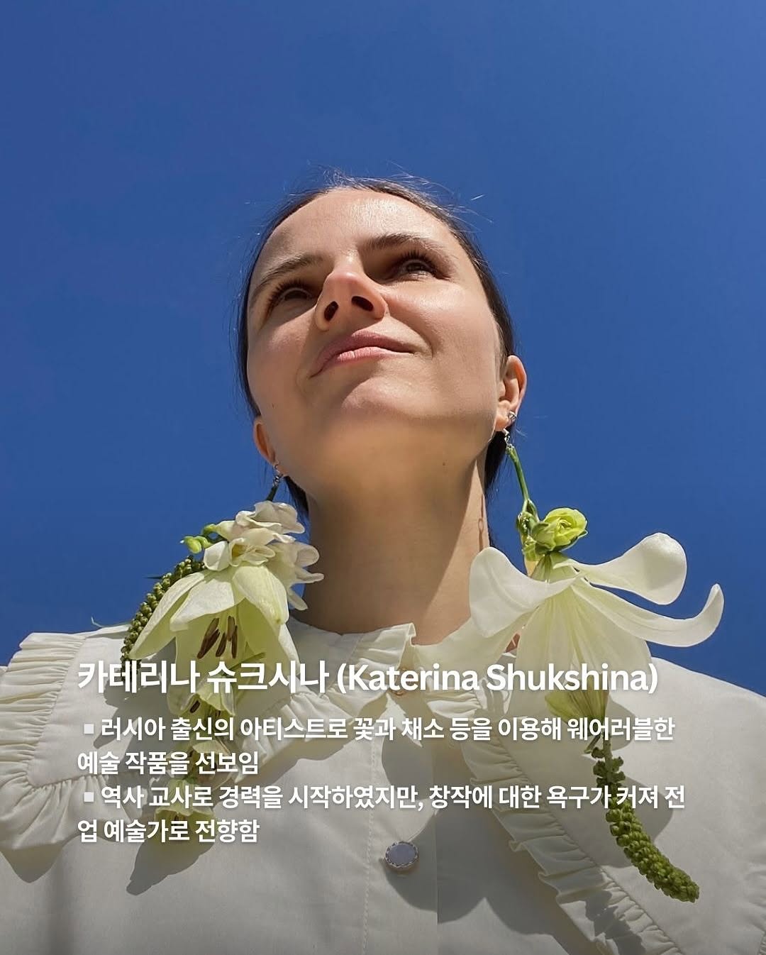◾️러시아 출신의 아티스트로 꽃과 채소 등을 이용해 웨어러블한 예술 작품을 선보임 ◾️역사 교사로 경력을 시작하였지만, 창작에 대한 욕구가 커져 전업 예술가로 전향함 ◾️어릴 적 시골에서 자라 자연과의 교감 경험을 바탕으로 작업함 ◾️일상에서 직접 채집한 소재로 주로 제작함 ◾️지속 가능성, 자연 소재 활용이라는 특성을 브랜드 가치와 연결해 다양한 협업을 선보임