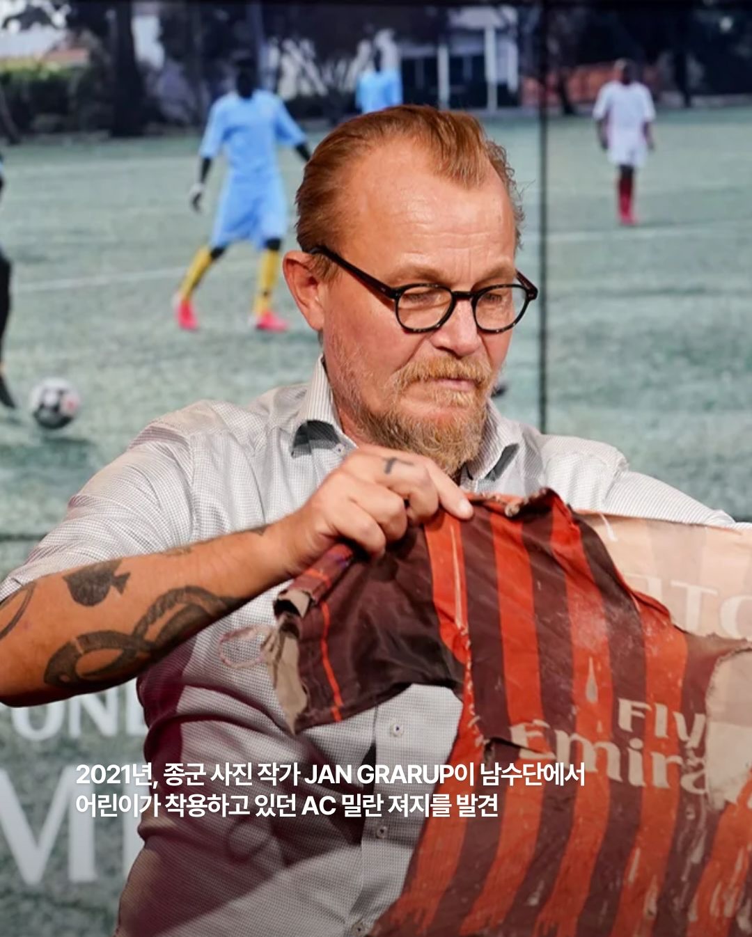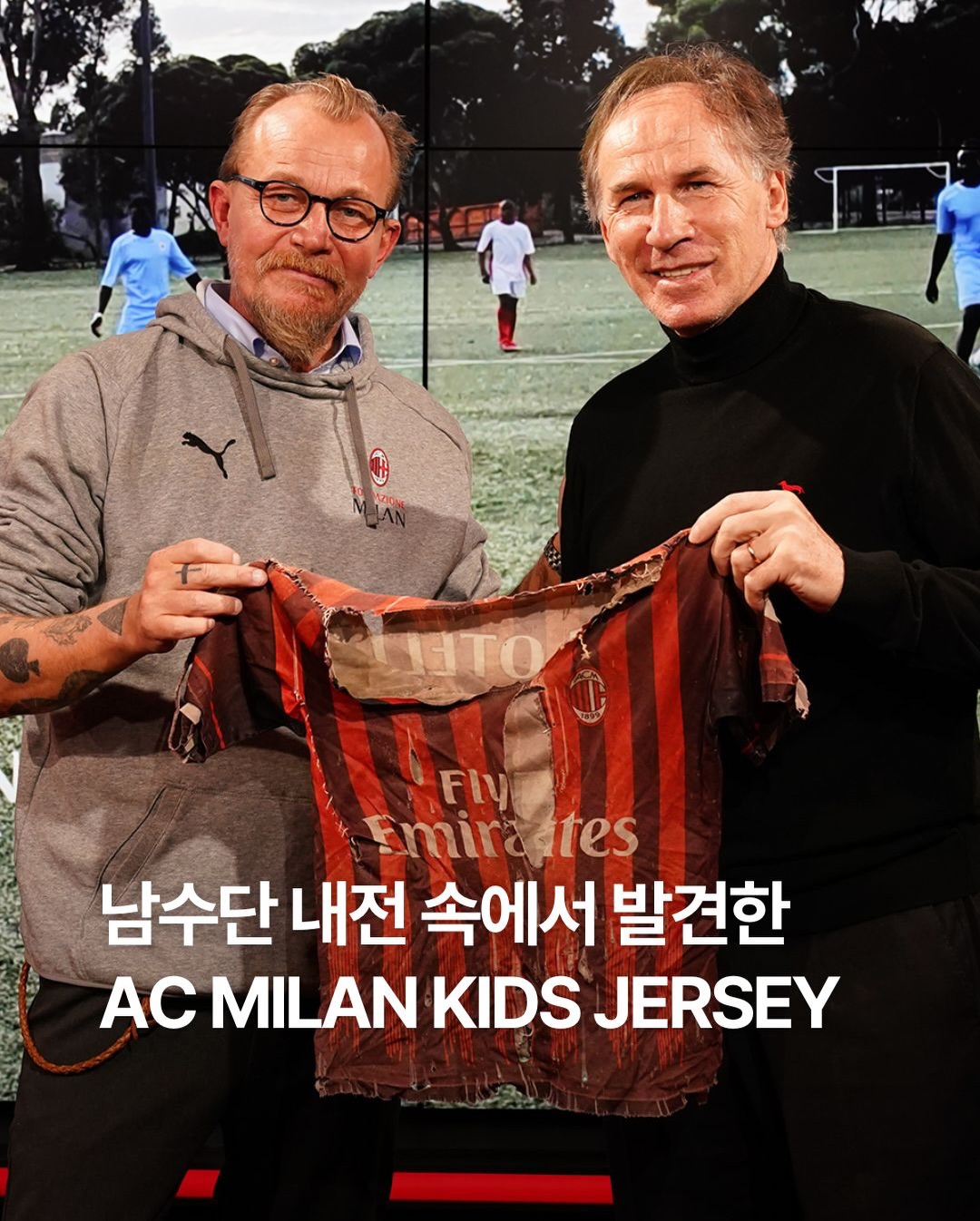 내전 속에서 발견된 AC 밀란의 17/18 시즌 유니폼 ⚽️2021년, 남수단 내전과 홍수 피해 현장에서종군 사진작가 Jan Grarup은 한 어린이가입고 있던 AC 밀란 유니폼을 발견했습니다찢기고 해진 채 꿰매어 입은 유니폼은어린이의 축구에 대한 애정을 고스란히 담고 있었습니다기자는 그 유니폼을 AC밀란에 기증했고AC밀란은 그 유니폼을 본사 뮤지엄에 전시!생활의 어려움 속에서도 스포츠에 대한 사랑을잃지 않았던 유니폼의 이미지를 전해드립니다 🔍📌 남수단에서 발견된 AC 밀란의 17/18시즌 유니폼(@acmilan)▪️남수단 내전 현장에서 발견된 17/18 시즌 키즈 유니폼 ▪️훼손된 상태에도 직접 꿰맨 흔적이 남아 있는 실착품 ▪️AC 밀란 본사 뮤지엄으로 전달되어 현재 전시 ▪️축구를 향한 개인적 애정이 담긴 상징적 사례