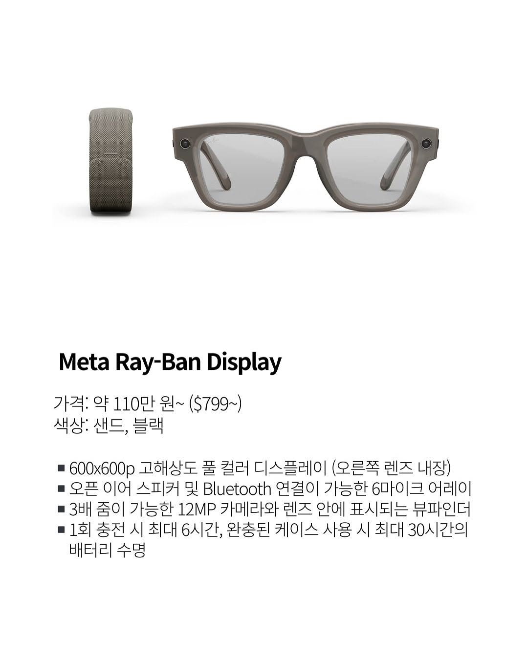 ▪️레이밴 특유의 클래식한 스타일과 고해상도 디스플레이 탑재 ▪️손짓으로 기기를 제어할 수 있는 근전도 신호(EMG)를 기반으로 한 ‘메타 뉴럴밴드’ 제공 ▪️가격은 799달러 (한화 약 111만 5천 원)부터 시작하며 9월 30일부터 일부 매장을 시작으로 판매 시작
