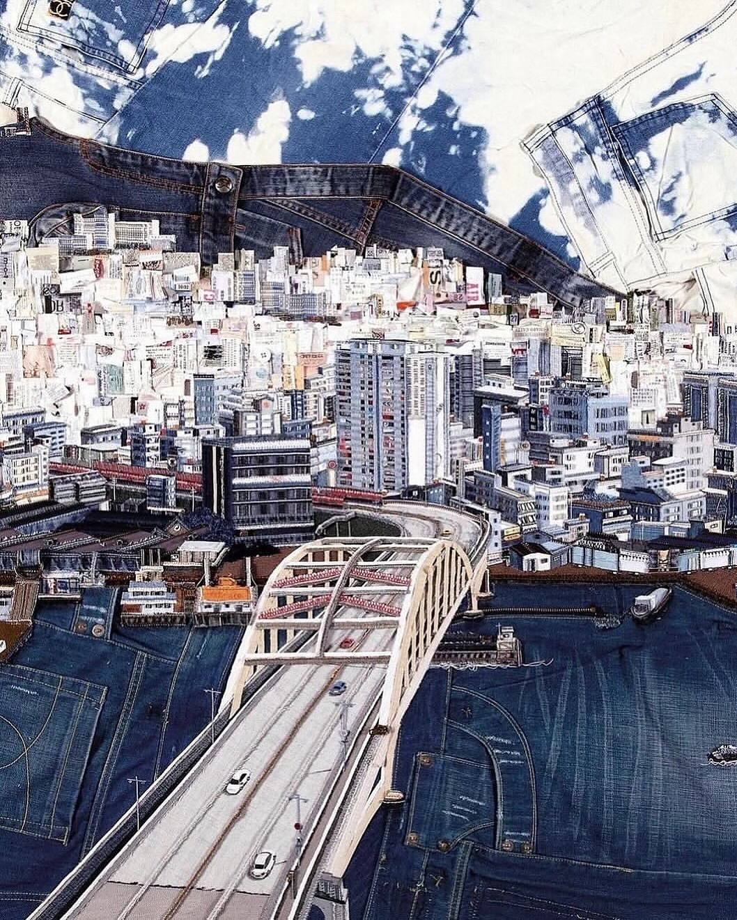 ▪️도시의 시간성과 생활사를 낡은 청바지 조각의 마모, 얼룩, 스티치로 표현한 연작 ▪️청바지에 새겨진 개인의 흔적을 집단의 풍경으로 확장한 것이 특징 ▪️인디고, 미드 블루, 페이드 블루 등 블루 톤의 컬러를 사용하여 하늘, 바다, 산의 그라데이션을 구현 ▪️가죽 탭은 불빛과 간판같은 포인트로도 사용됨