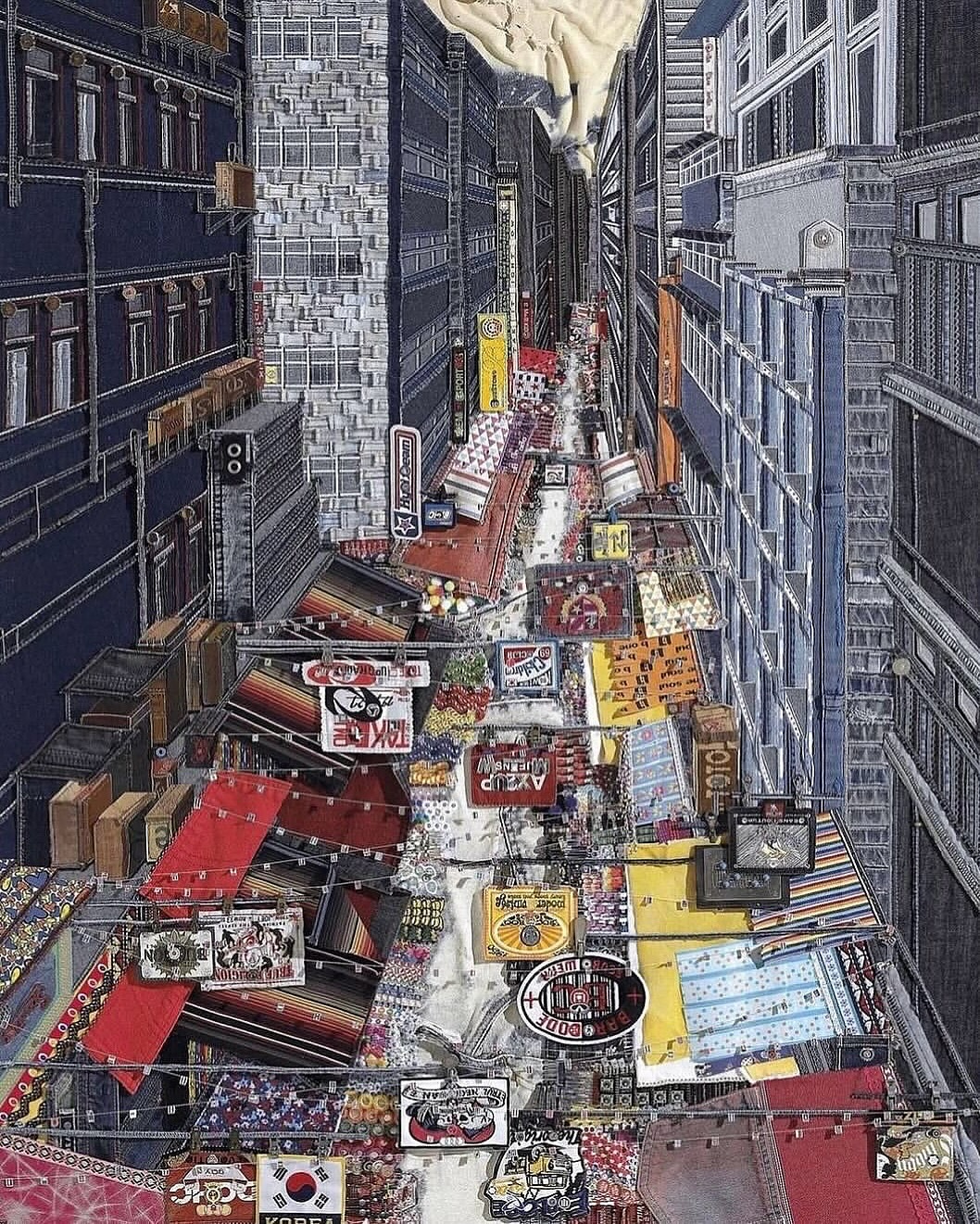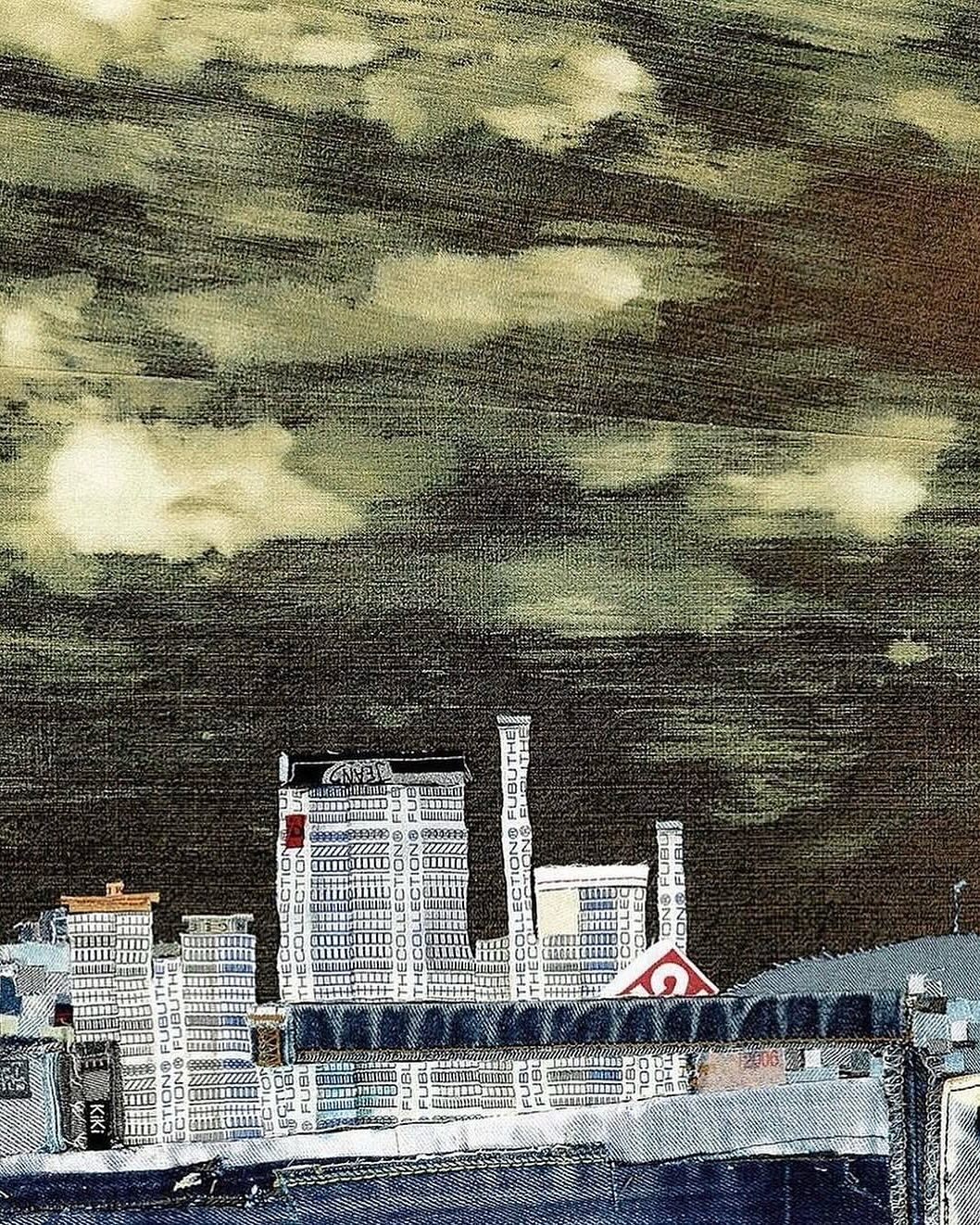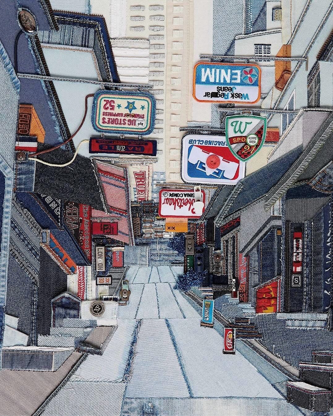 ▪️포켓, 지퍼, 라벨, 솔기 같은 청바지의 부속을 잘라 붙이고 꿰매어 골목, 전봇대, 창문, 스카이라인 등을 구성하는 텍스처 회화가 특징