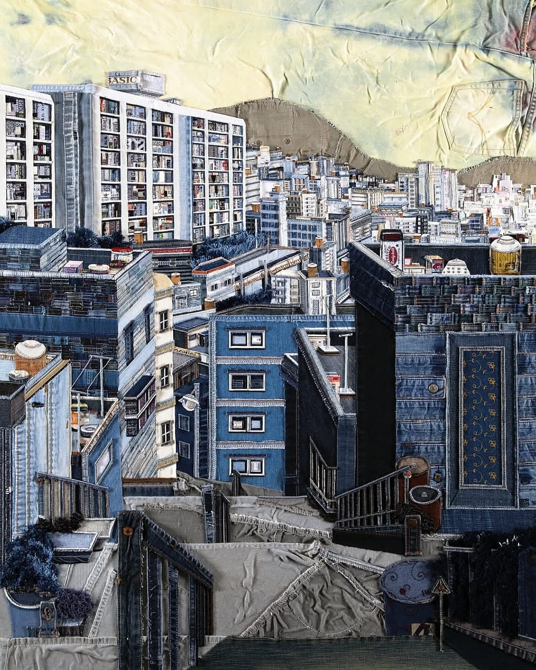버러진 청바지 조각과 아크릴를 콜라주 방식으로 겹쳐 붙이고 꿰매는 작업을 통해 도시의 풍경을 만들어내는 최소영 작가의 연작 <Denim Landscapes>