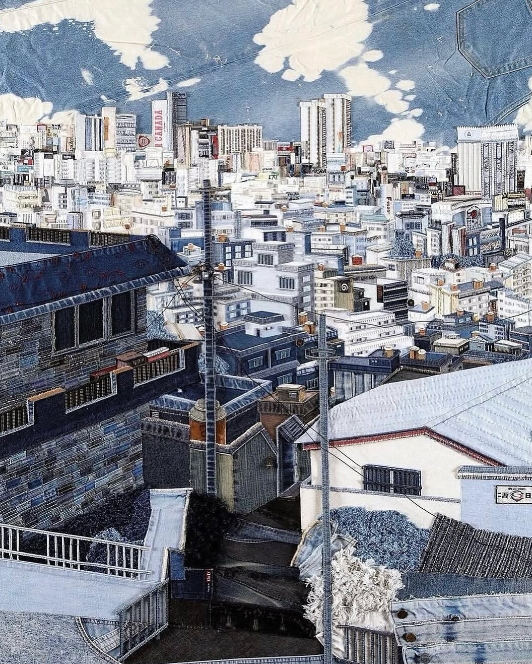 ▪️도시의 시간성과 생활사를 낡은 청바지 조각의 마모, 얼룩, 스티치로 표현한 연작
