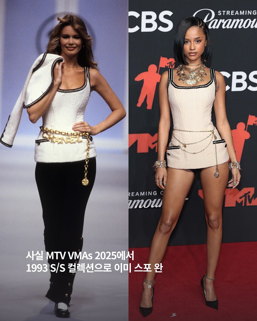 ▪️1990년대 샤넬 헤리티지를 오마주로 한 스타일을 보여주는 타일라의 ‘CHANEL’ 뮤직비디오 ▪️헤인즈 민소매 탱크톱을 제외한 모든 착장은 샤넬 ▪️2025 MTV VMA에서 착용한 샤넬 톱 착장도 이번 뮤직비디오를 티징 하기 위한 스포 ▪️스타일리스트 론 하틀벤이 뮤직비디오를 위해 샤넬 빈티지와 아카이브 제품들을 셀렉