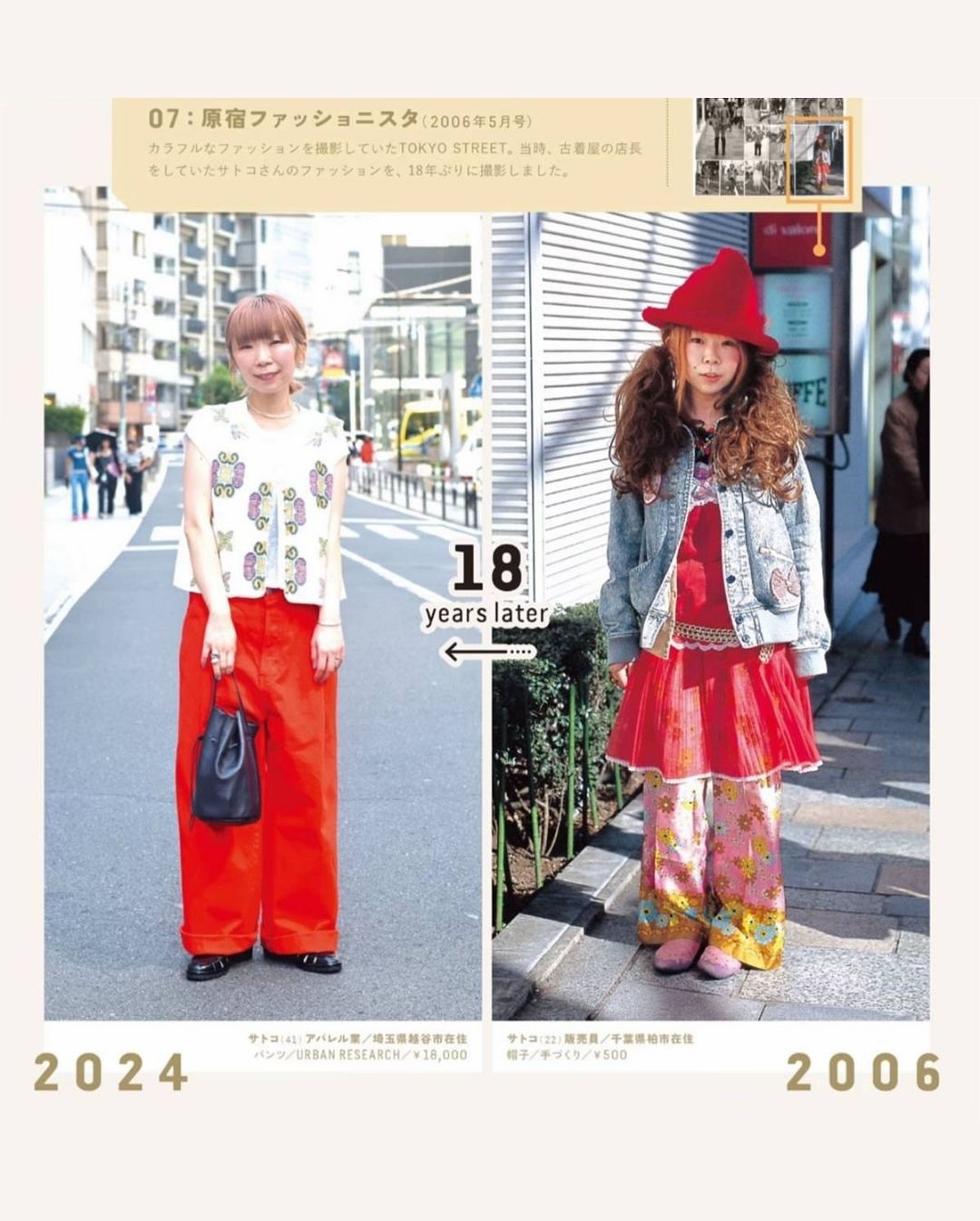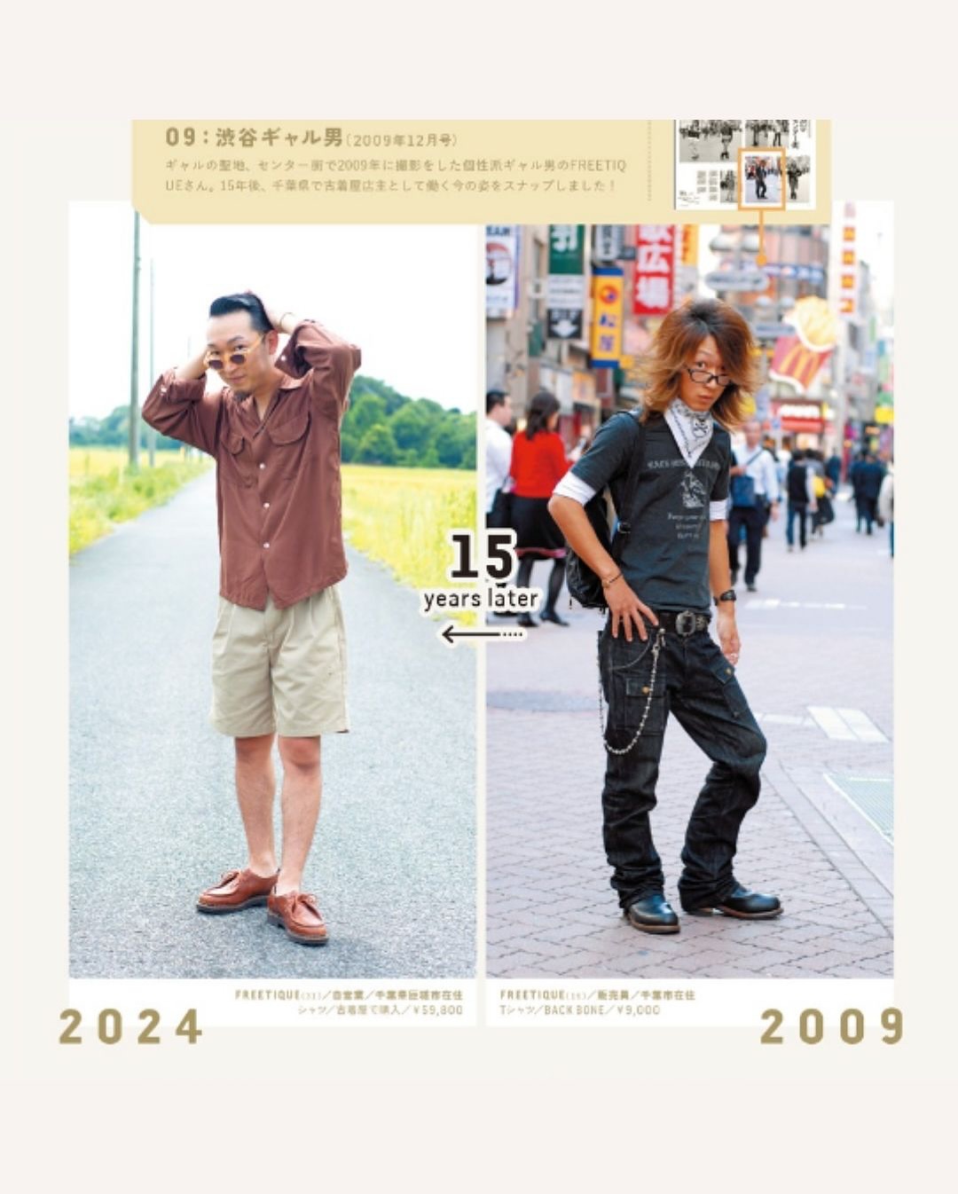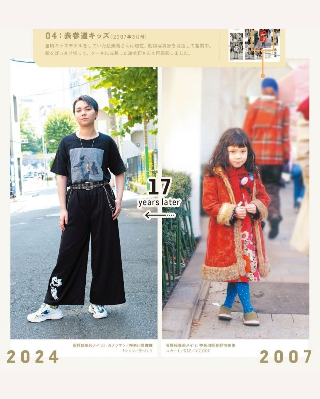 ▪️2004년 창간 이후 쌓아온 스냅 사진에 출연한 일반인들을 다시 찾아 촬영한 프로젝트 ▪️’그때와 지금’을 나란히 보여주는 기획으로 동일 인물을 당시 사진과 똑같은 포즈·구도로 촬영해 스타일, 직업, 가족관계의 변화를 한 눈에 비교 ▪️특히 2000년대 초 시부야의 갸루, 아키하바라 코스플레이어, 오모테산도의 오샤레 키즈 등 유니크한 스타일의 인물들을 다시 취재 ▪️셀럽 중심이 아닌 ‘일반인이 주인공’인 매거진의 정체성을 시간의 층위를 통해 아카이브로 증명