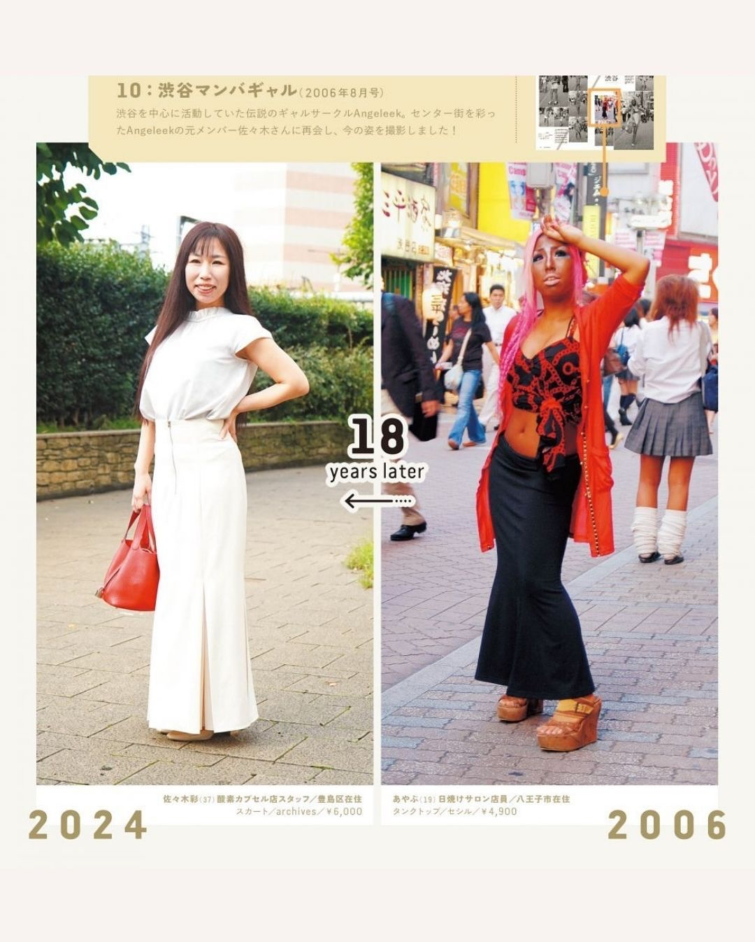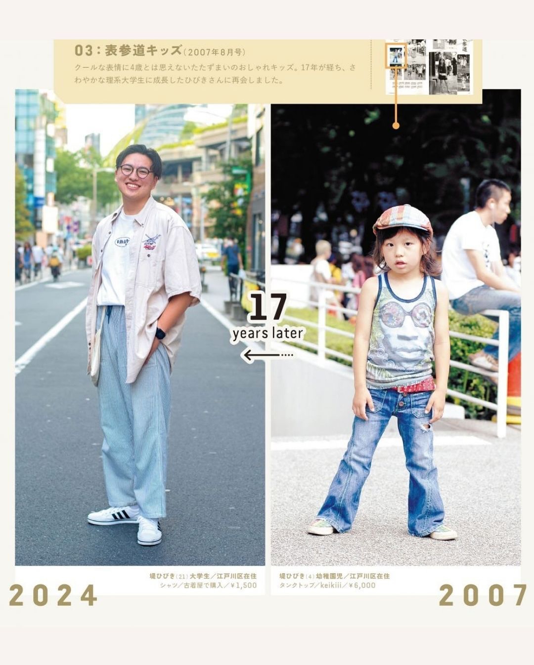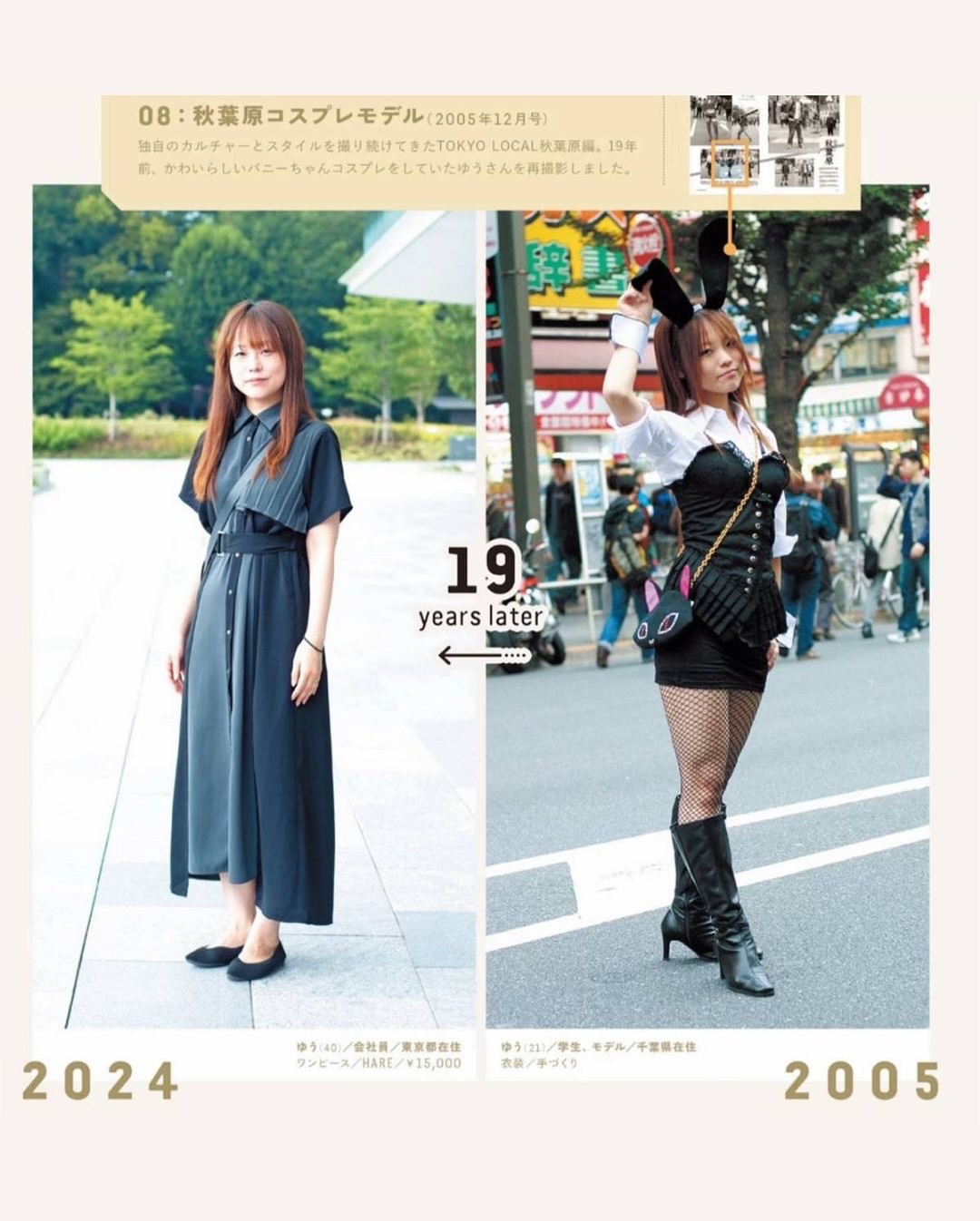 ▪️2004년 창간 이후 쌓아온 스냅 사진에 출연한 일반인들을 다시 찾아 촬영한 프로젝트 ▪️’그때와 지금’을 나란히 보여주는 기획으로 동일 인물을 당시 사진과 똑같은 포즈·구도로 촬영해 스타일, 직업, 가족관계의 변화를 한 눈에 비교 ▪️특히 2000년대 초 시부야의 갸루, 아키하바라 코스플레이어, 오모테산도의 오샤레 키즈 등 유니크한 스타일의 인물들을 다시 취재 ▪️셀럽 중심이 아닌 ‘일반인이 주인공’인 매거진의 정체성을 시간의 층위를 통해 아카이브로 증명