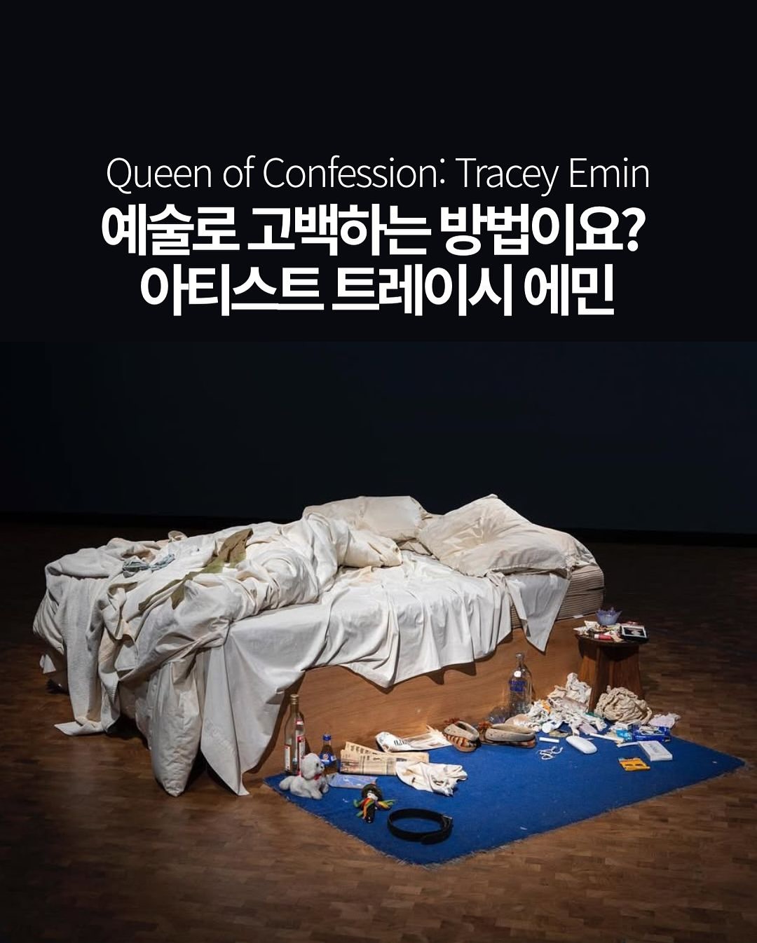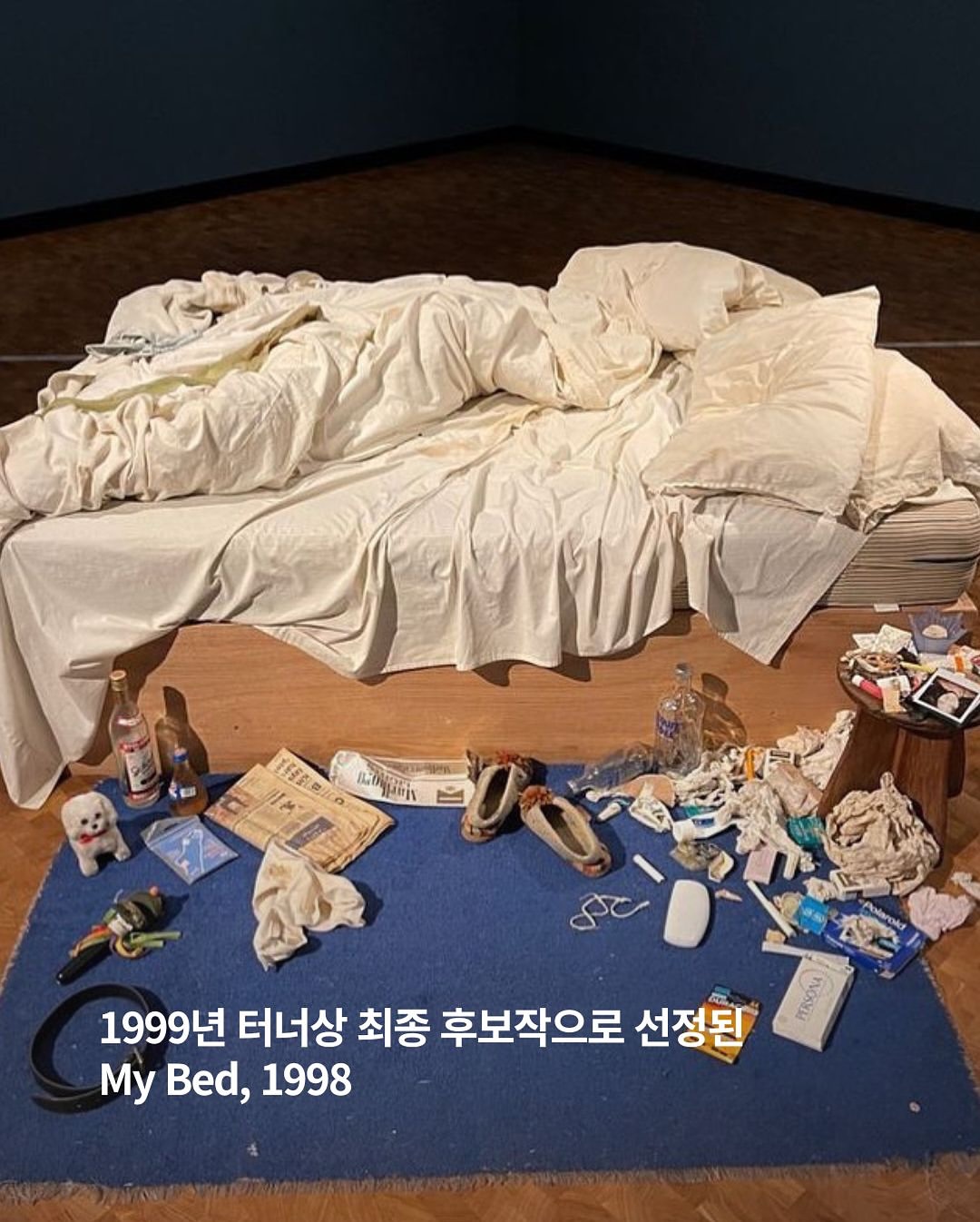 ▪️정리되지 않은 침대와 그 주변의 온갖 잡동사니들을 그대로 전시 ▪️침대 주위에는 지극히 사적이고 추하게 느껴질 수 있는 물건들이 적나라하게 흩어져 있음 ▪️가장 사적이고 고통스러운 경험을 예술로 승화시켜 논쟁을 끌어낸 작품으로 평가 ▪️1999년 터너상 최종 후보작으로 선정되며 “이게 예술이냐”는 대중적 논쟁을 일으킴 ▪️오늘날에는 1990년대 영국 현대미술을 대표하는 상징적 작품으로 인정받고 있음