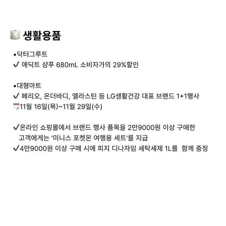 ▪️대형마트 ✔️ 페리오, 온더바디, 엘라스틴 등 LG생활건강 대표 브랜드 1+1행사 🗓️11월 16일(목)~11월 29일(수)