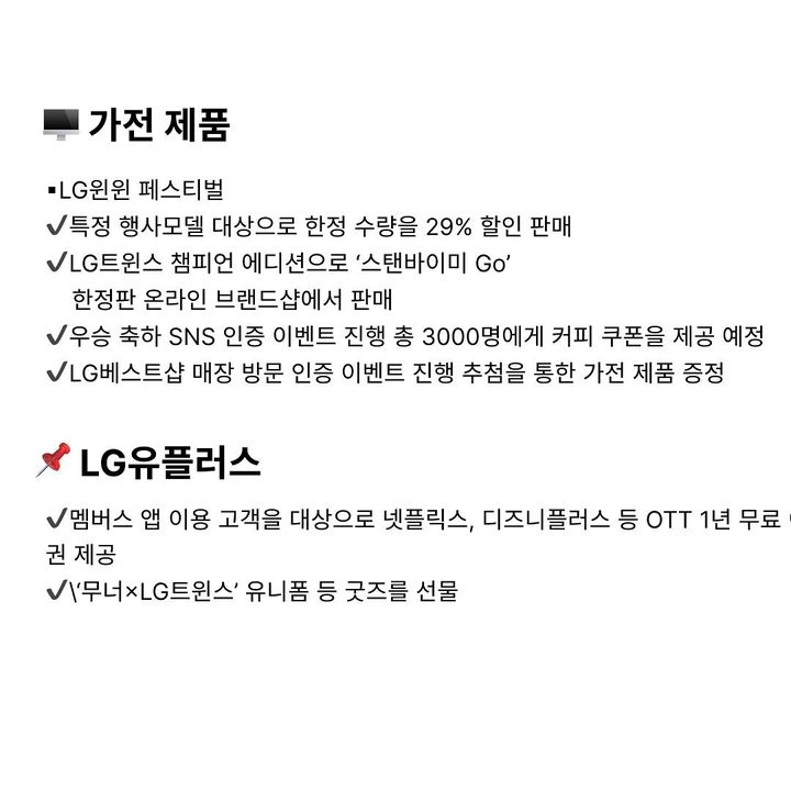 ▪️LG 윈윈 페스티벌 ✔️특정 행사모델 대상으로 한정 수량을 29% 할인 판매 ✔️LG트윈스 챔피언 에디션으로 ‘스탠바이미 Go’ 한정판 온라인 브랜드샵에서 판매 ✔️우승 축하 SNS 인증 이벤트 진행 총 3000명에게 커피 쿠폰을 제공 예정 ✔️LG베스트샵 매장 방문 인증 이벤트 진행 추첨을 통한 가전제품 증정 ✔️LG전자 온라인 브랜드샵 회원 가입 후 룰렛 이벤트에 참여시 다양한 상품 증정