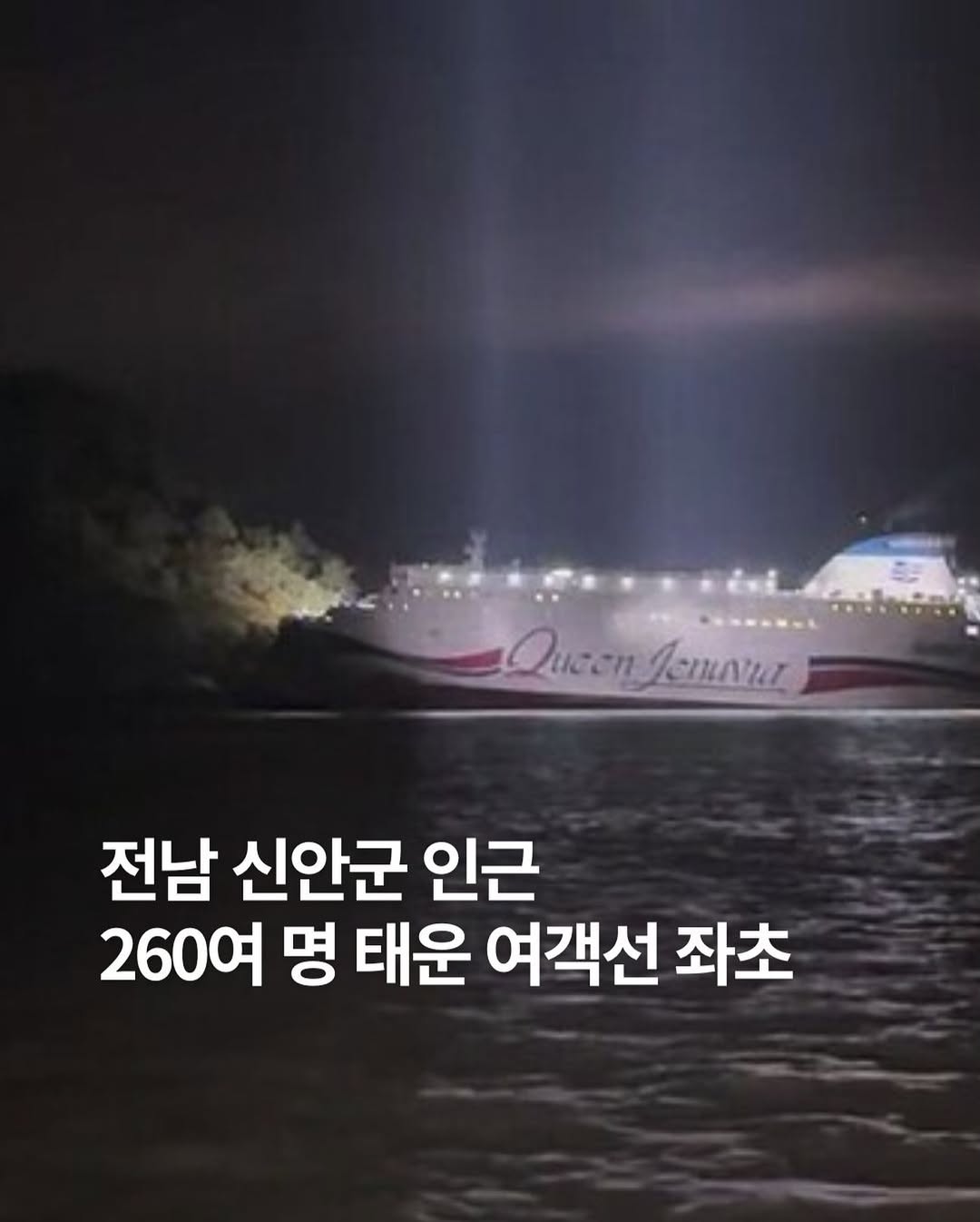 좌초된 여객선은 2만6546톤급 ‘퀸제누비아 2호’로 승객 246명과 승무원 21명 등 총 267명이 탑승한 채 제주에서 목포로 향하던 중 암초에 걸린 것으로 파악됐습니다 현재 침수·화재 징후는 없으며, 선체는 왼쪽으로 약 15도 기울어진 상태로 선체 침수 상황을 확인 중인 것으로 알려집니다