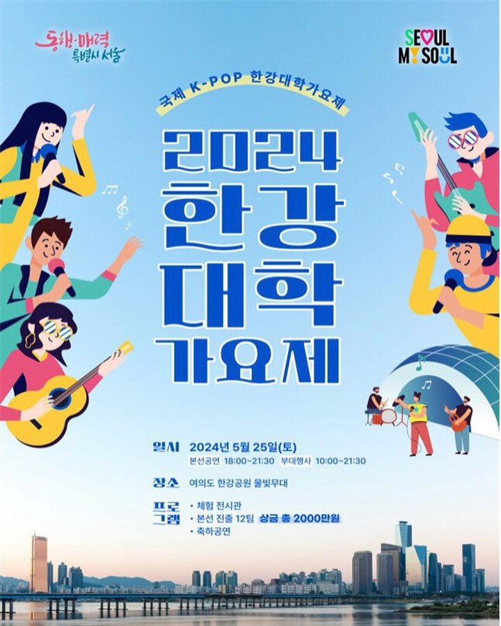 서울시는 여의도한강공원 물빛무대에서 ‘2024 한강대학가요제’가 진행될 예정이라고 밝히며 상업성 위주의 기존 오디션 문화에서 벗어나 대학생의 순수한 창작 열정을 알리기 위해 이를 개최한다고 전하였습니다.