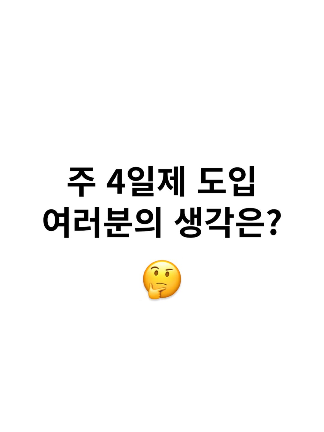 주 4일제 여러분의 생각은?다음달부터 주 4일제를 도입하기로 발표한 카페 24주 4,5일제가 도입되면서 근로시간에 대한변화가 어떻게 이어질지 주목되고 있습니다주 4일제 여러분의 생각은 어떠신가요?📌 주 4일제란? ▪️주 5일(40시간) 근무를 줄여 주 4일만 일하는 제도