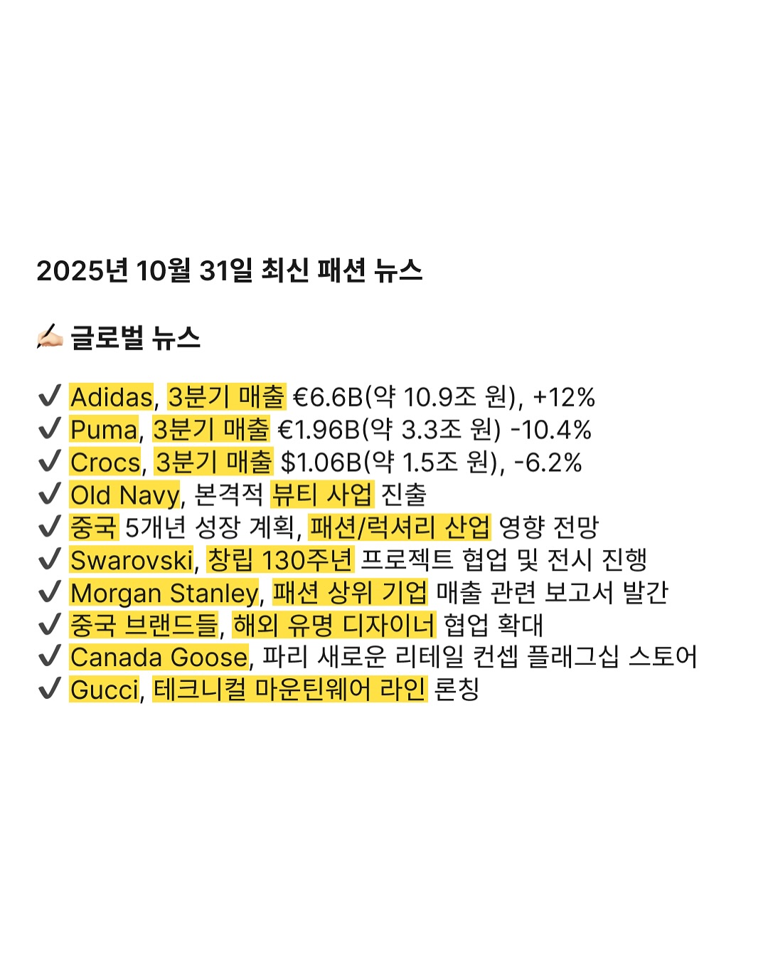 • Puma는 3분기 매출 €1.96B(약 3.3조 원), -10.4% 기록; 브랜드 모멘텀 약화 속 과잉 재고와 유통 품질 저하 등 다양한 문제점 지적