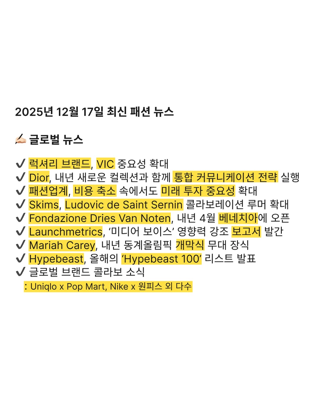 • 에르메스는 다음 달 한국 시장에서 의류·가방·주얼리 등 주요 제품에 대해 가격 인상을 단행; 최근 셀러(판매자)를 통해 내년 1월 인상 계획을 안내하기 시작
