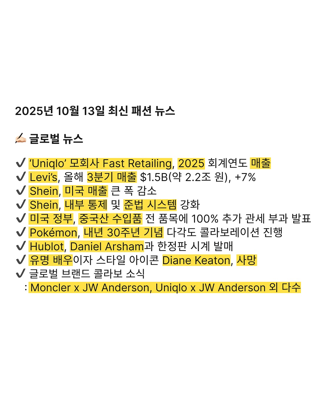 • ‘Uniqlo’ 모회사 Fast Retailing은 2025년 회계연도 매출 ¥3,400BY(약 32.3조 원), +9.6%; 영업이익은 ¥564.2B(약 5.4조 원), +12.6% 기록 화제