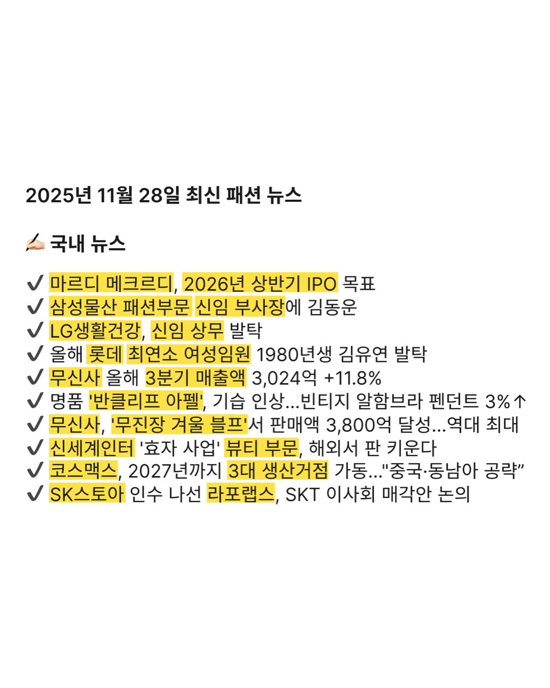 • 패션 브랜드 마르디 메크르디가 2026년 상반기 IPO(기업 공개)를 목표로 상장 준비를 본격화; 패션 넘어 패밀리·라이프스타일로 확장