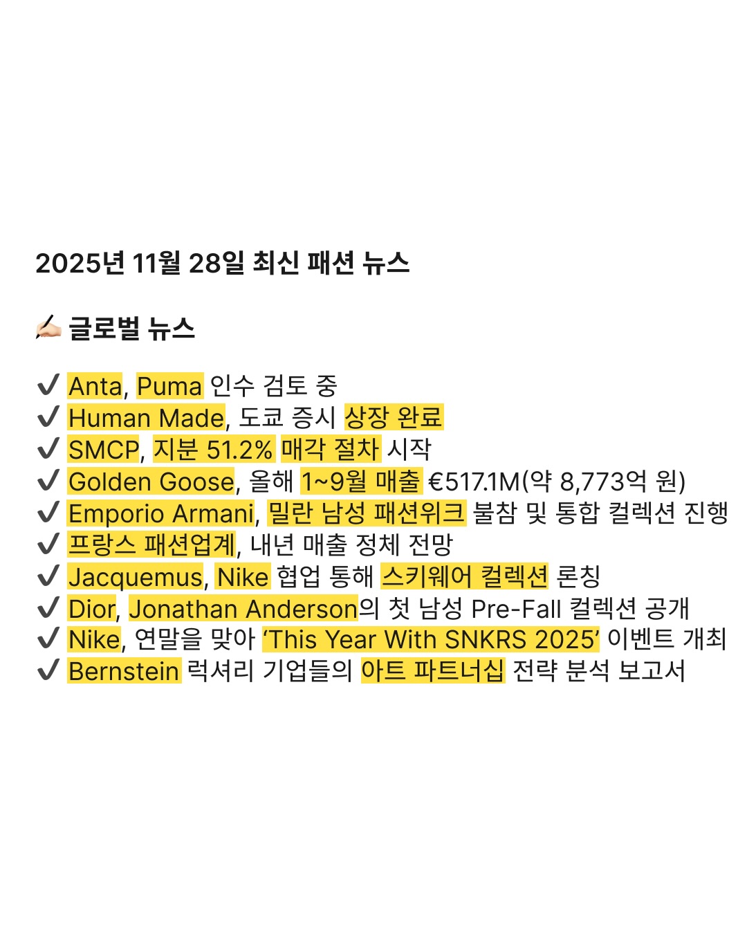 • Golden Goose는 올해 1~9월 매출 €517.1M(약 8,773억 원), +13% 기록, 특히 D2C 직영점 매출이 21% 신장하여 전체 성장 주도