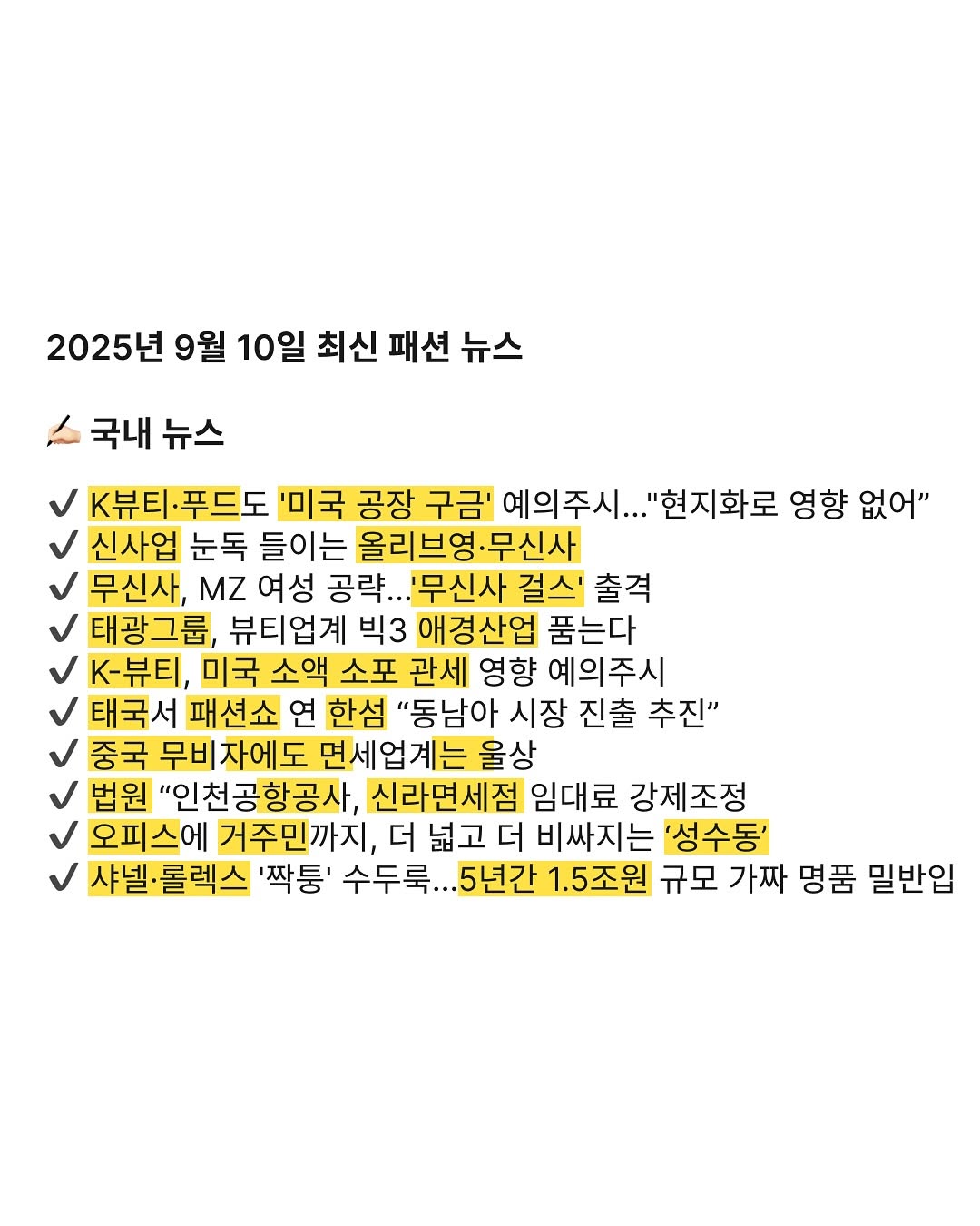 • 무신사글로벌은 8월 27일부터, CJ올리브영은 27일부터 미국으로 배송되는 모든 주문 건에 대해 관세 적용에 따른 가격 인상을 공지, 상황 주시하며 프로모션 등 대책 검토