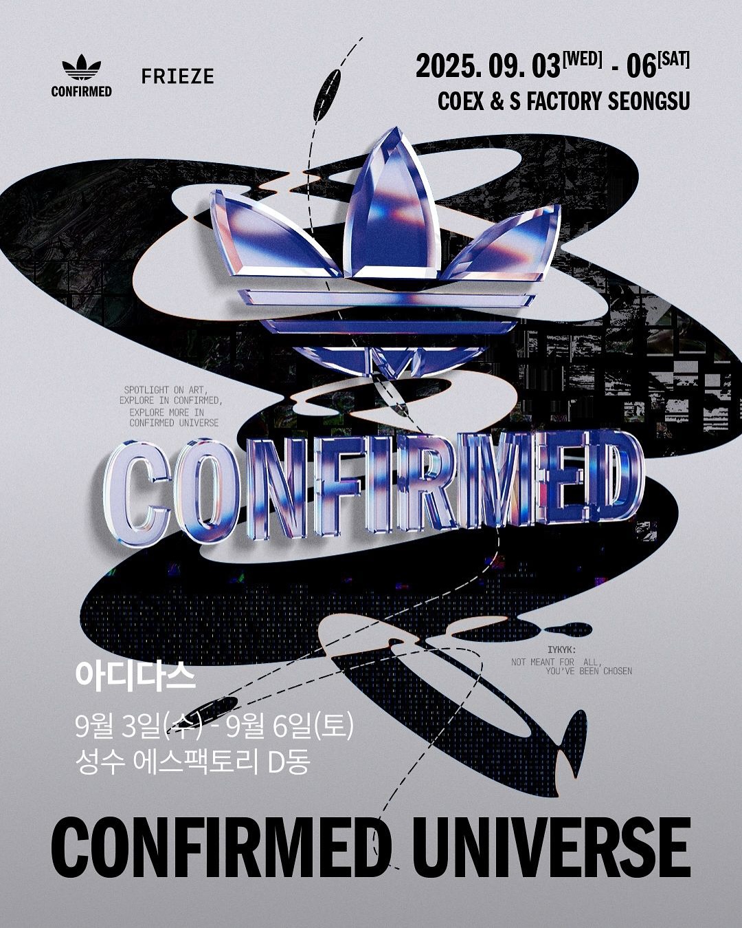 📌아디다스 (@originals_kr) 🗓️ 9월 3일(수) - 9월 6일(토) 📍성수 에스팩토리 D동 (서울시 성동구 연무장 15길 11) ▪️아디다스 컨펌드 앱의 첫 공식 파트너로서 디지털 세계를 현실로 확장하는 컨펌드 유니버스 체험형 행사