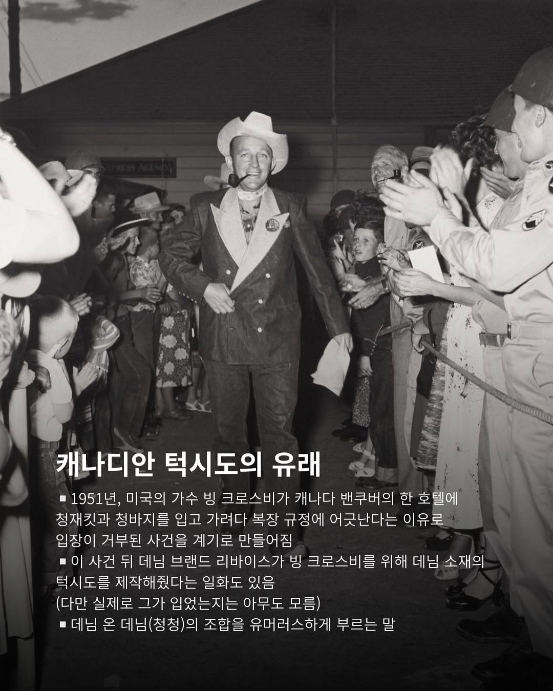 ▪️1951년, 미국의 가수 빙 크로스비(Bing Crosby)가 캐나다 밴쿠버의 한 호텔에 청재킷과 청바지를 입고 가려다 복장 규정에 어긋난다는 이유로 입장이 거부된 사건을 계기로 만들어짐 ▪️이 사건 뒤 데님 브랜드 리바이스가 빙 크로스비를 위해 데님 소재의 턱시도를 제작해줬다는 일화도 있음 (다만 실제로 그가 입었는지는 아무도 모름) ▪️데님 온 데님(청청)의 조합을 유머러스하게 부르는 말