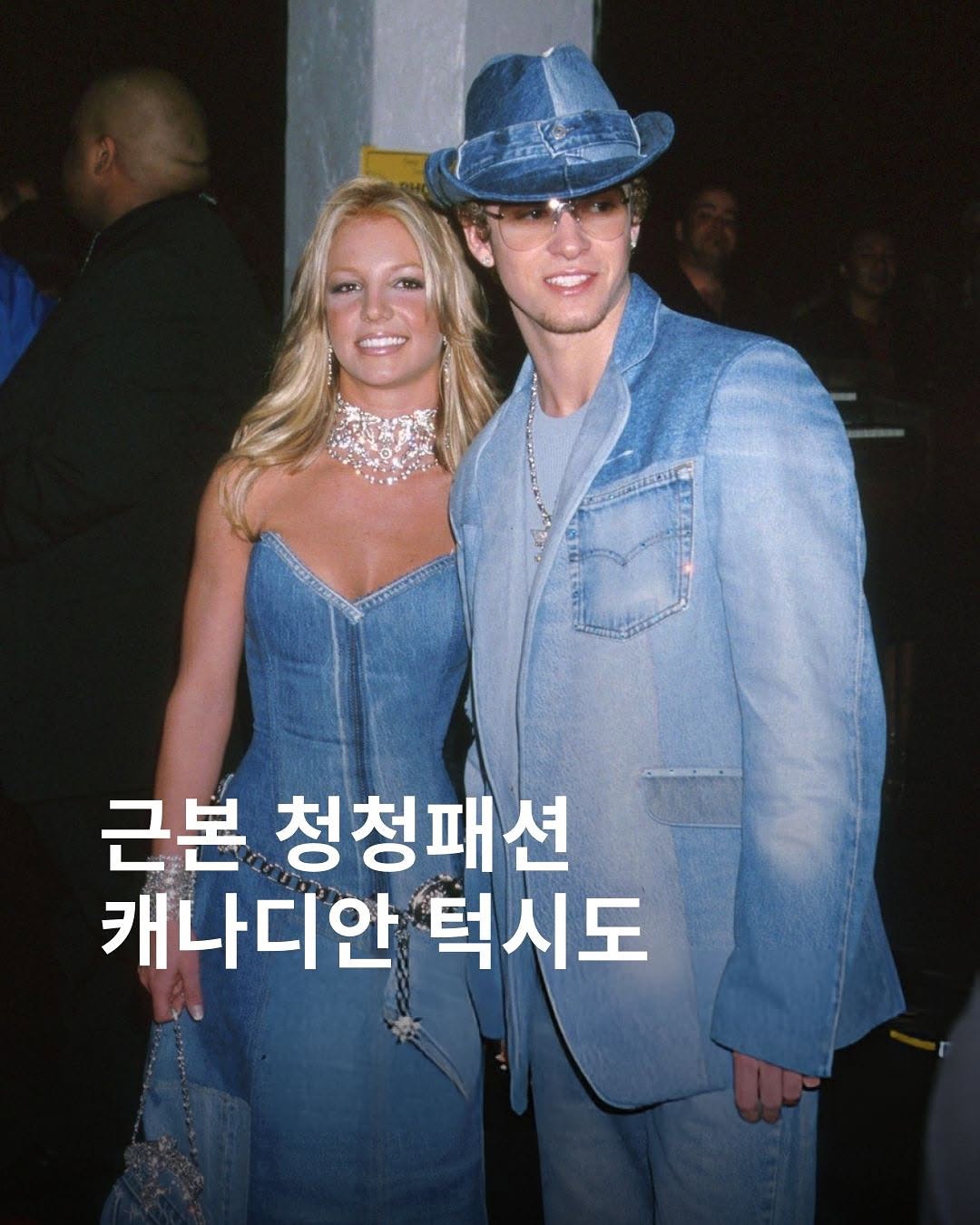 ▪️노동계층의 작업복이었던 데님이 60~70년대 록스타들이 착용하면서 세계적인 인기를 불러일으킴 ▪️70~80년대 패션계에도 소개됨 → 쿨 키즈 룩이라 불리며 애시드 워시 데님 룩은 광고에 자주 등장함 ▪️캐나다 턱시도는 그런 “일상 복장 + 포멀한 옷차림”의 경계선에서 유머 + 아이코닉 스타일로 자리 잡음 ▪️2001년 아메리칸 뮤직 어워드에서 브리트니 스피어스와 저스틴 팀버레이크의 캐나디안 턱시도 룩은 지금까지도 가장 패셔너블하게 소화된 사례로 꼽힘